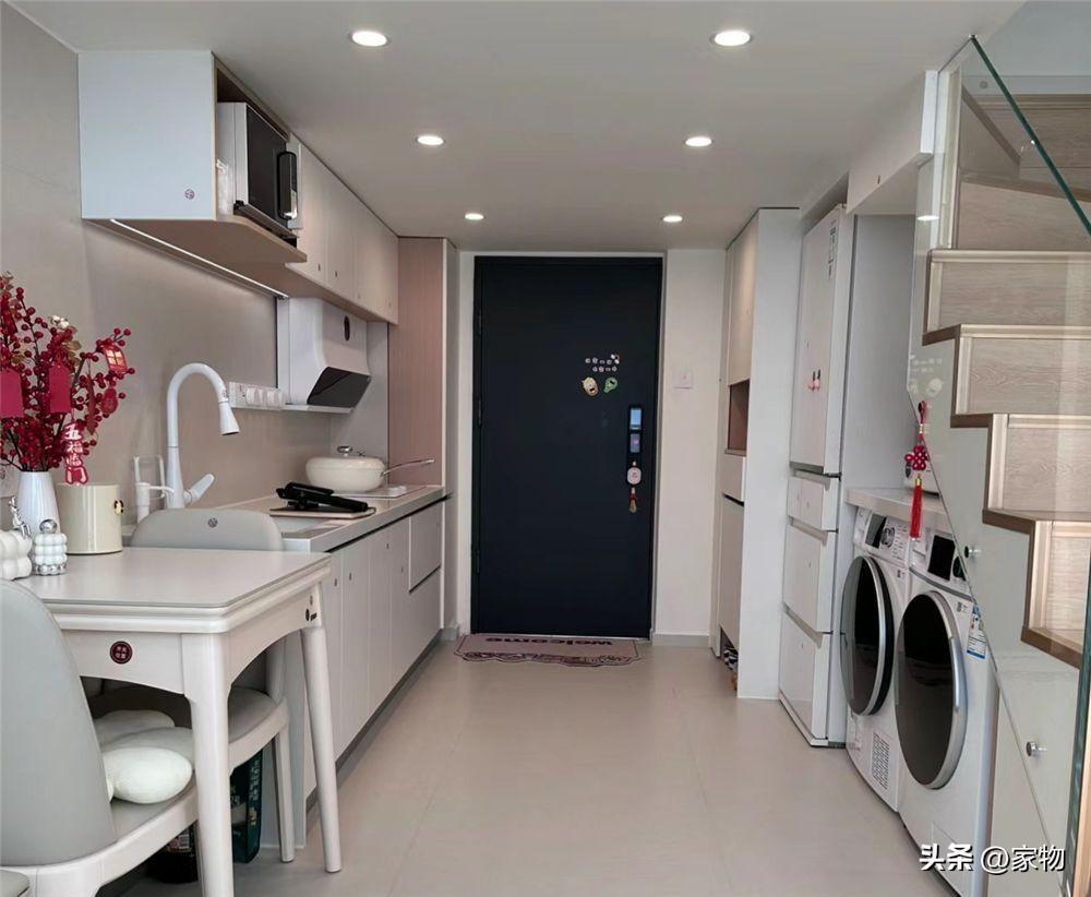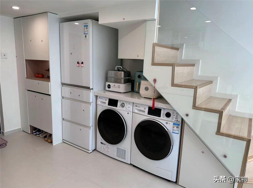 哦對了,利用樓梯間的位置,這位姑娘還嵌入了一臺洗衣機和一臺烘乾機,旁邊放冰箱也剛好合適,既將這雞肋空間充分利用起來,又變成了廚房的擴展,我個人感覺很不錯。