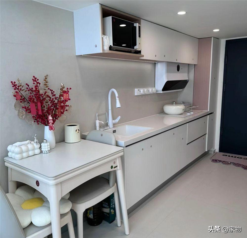 對面一側,是家裏的開放式廚房和小餐桌,因爲面積很小,平日裏也是一個人居住,故而餐桌靠牆,凳子也收入餐桌下,有需要的時候,再將它拉出來放好就行。