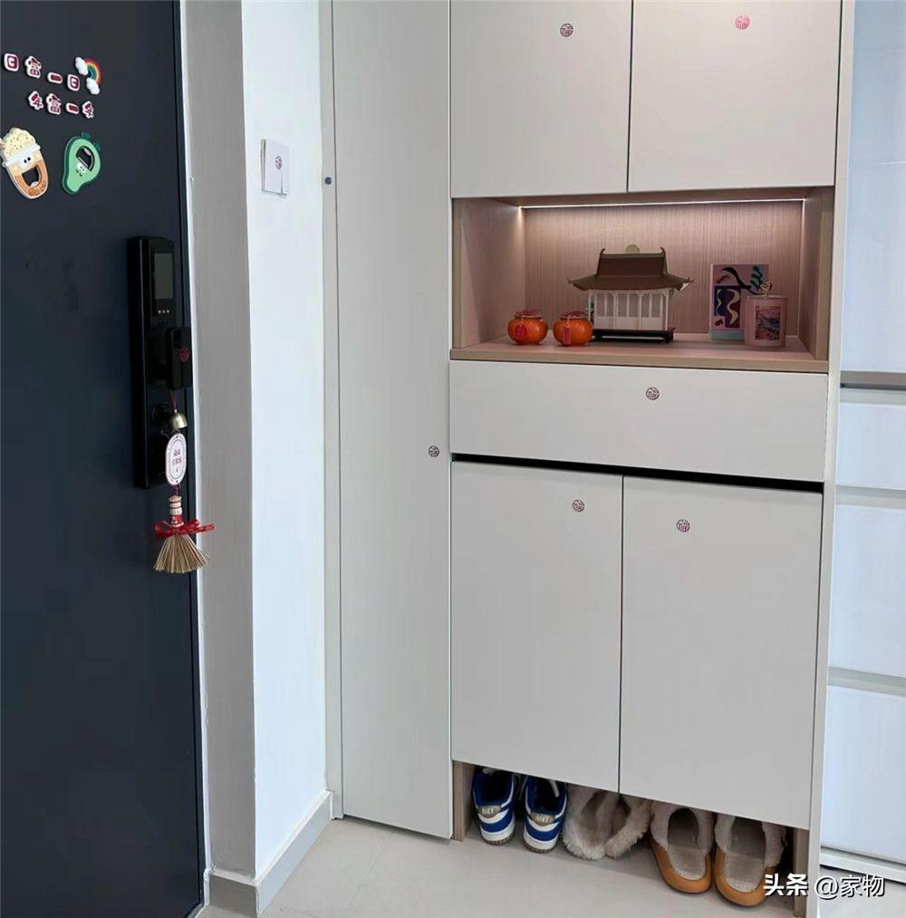 剛一進入家中,入門玄關的開放空間就讓人眼前一亮,玄關櫃只佔據了一小片區域,做出鞋櫃留空、底櫃收納、中間開放格,和上櫃側櫃大格,一切都顯得井然有序。