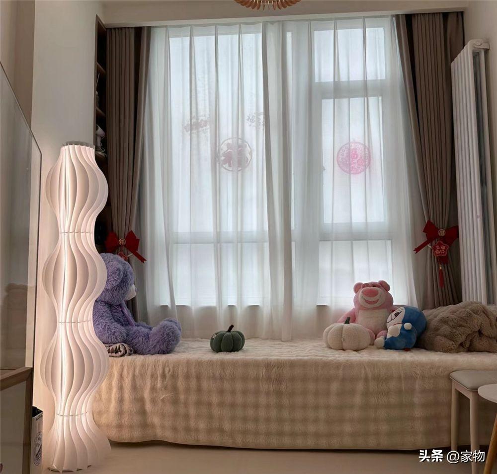 裏面剩下的空間不多,乾脆就用飄窗代替傳統沙發,放在牀邊,不僅能保證舒適,又可以利用底部空間進行收納置物,放上幾個毛絨玩具,顯得也十分可愛俏皮。