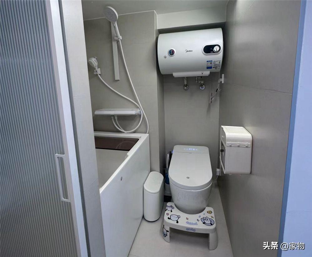 洗手池外移後,衛生間內的佈置輕鬆了許多——在馬桶上面裝熱水器,旁邊用高浴缸進行隔斷,既劃分出了淋浴區,又不容易弄髒馬桶區域,排水更加流暢。