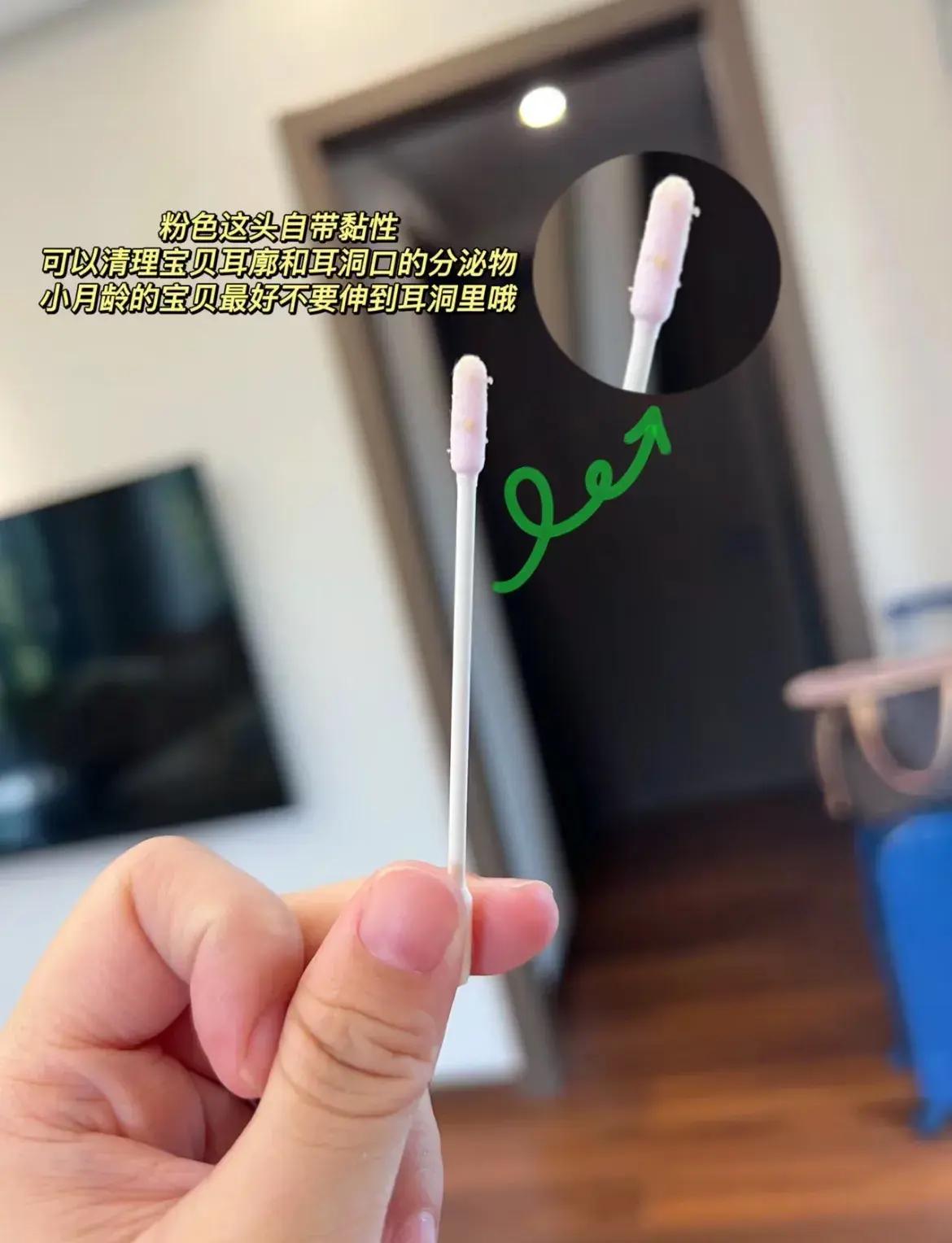 仔細研究後才知道,它的受衆羣體是嬰兒,粉色帶粘性的那一頭,是用來清理嬰兒耳鼻的。
