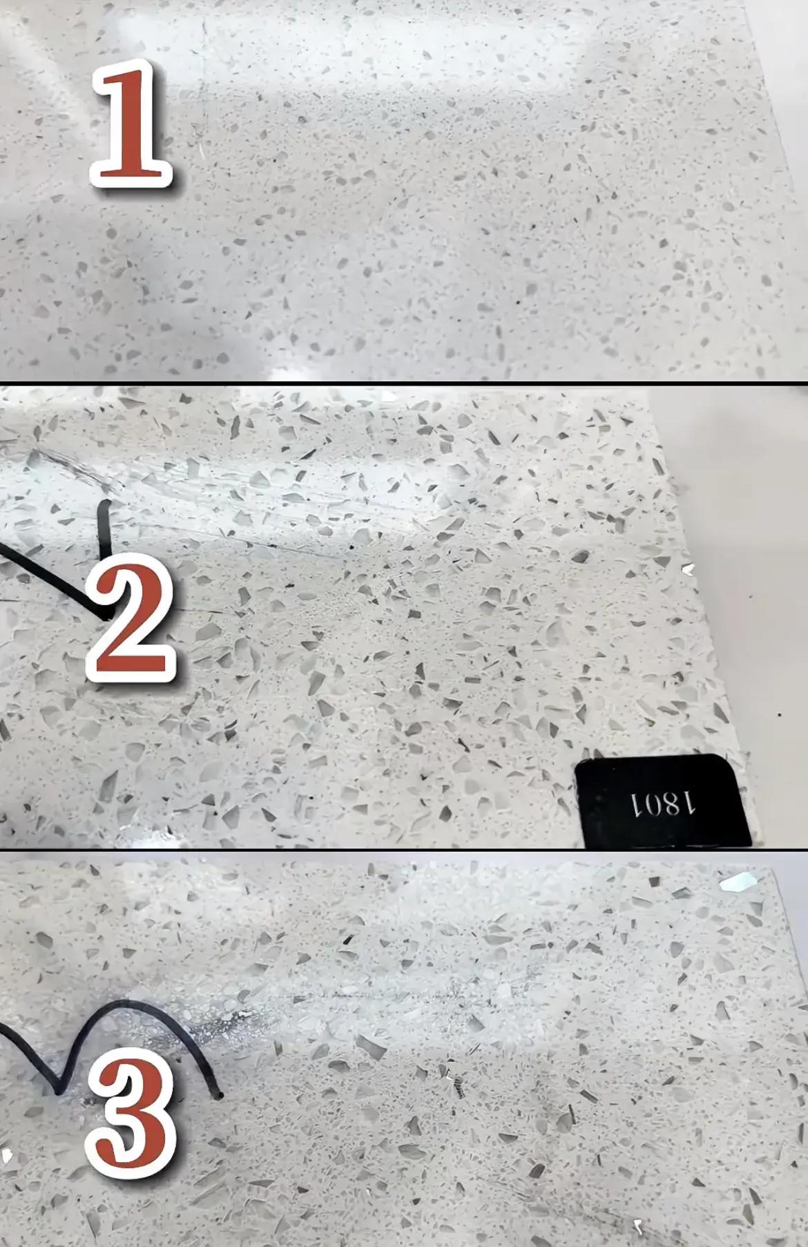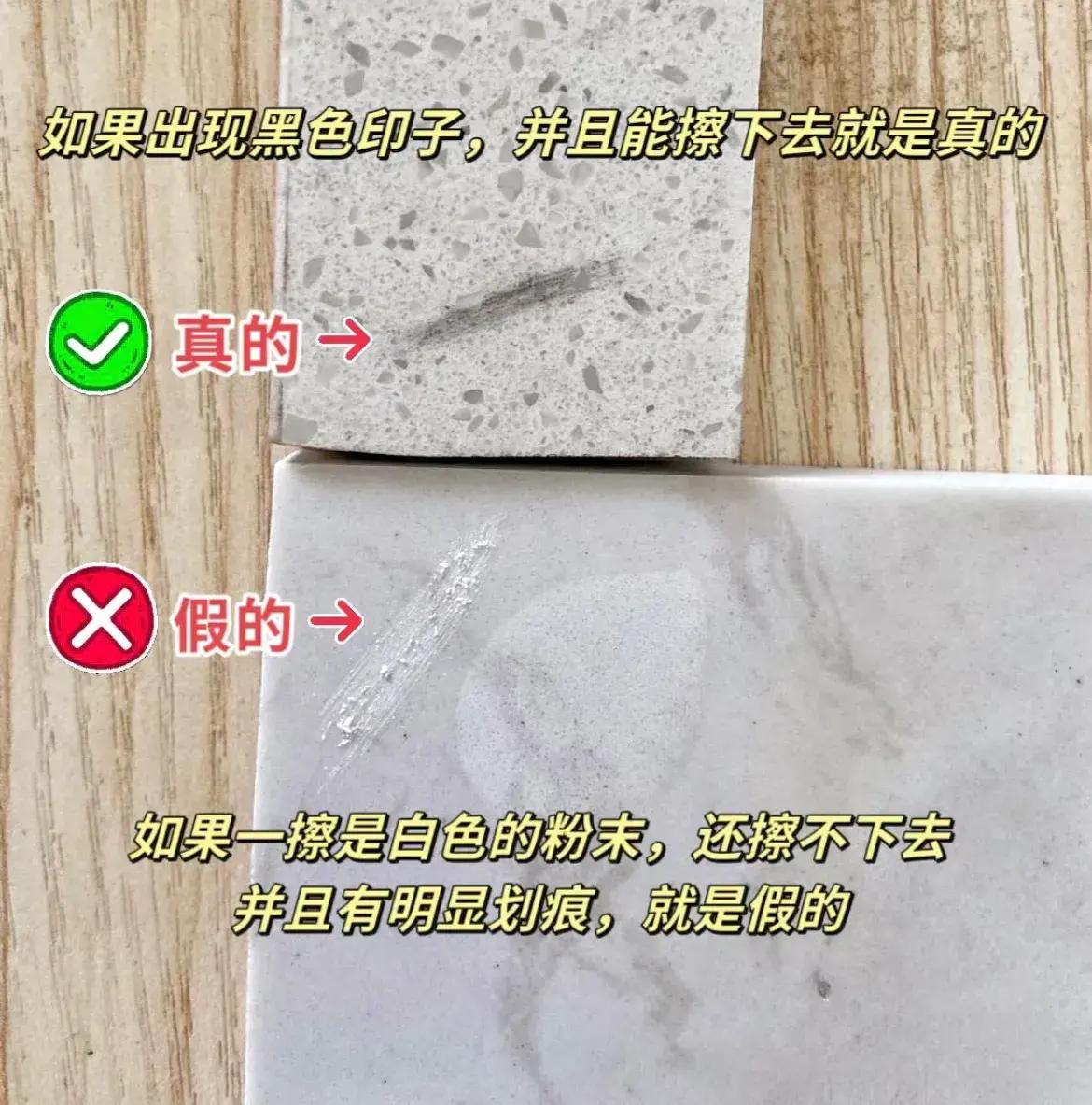 拿鑰匙磨或者刀片使勁劃,崗石硬度不夠,就會產生劃痕,一摸還有白色粉末,而石英石硬度高,最多是劃出金屬印子,是能擦掉的。