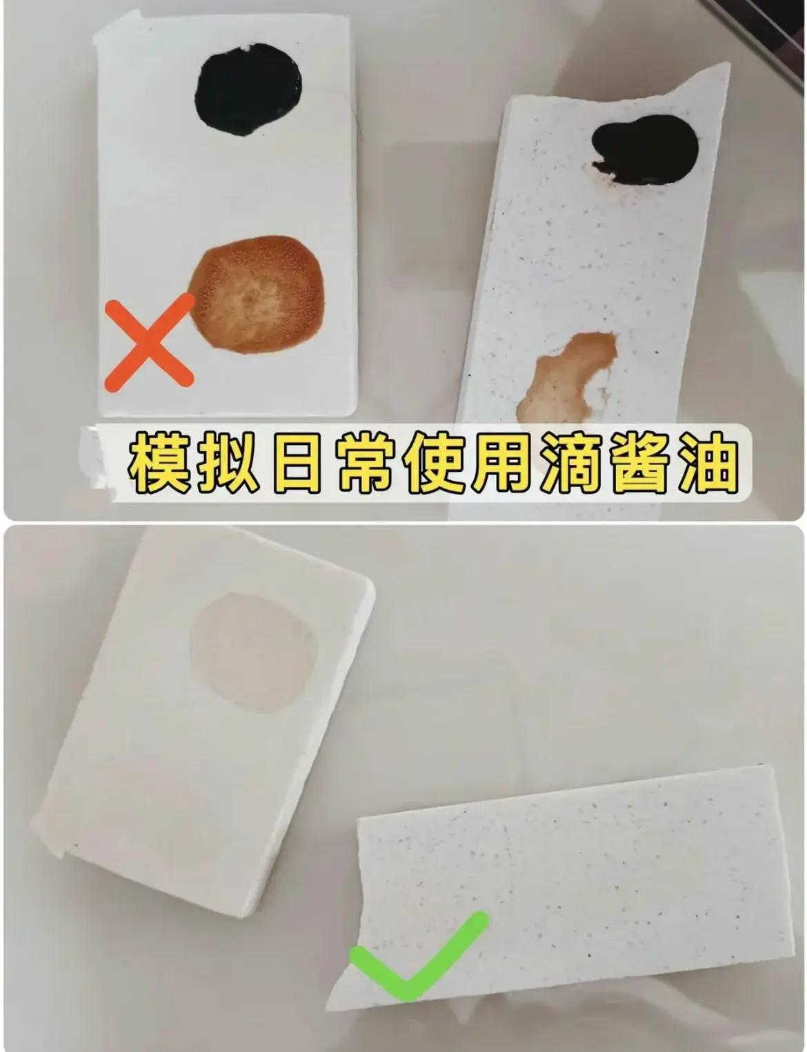 用馬克筆畫、醬油、火龍果等任何帶有色素的東西滴在上面做試驗,看會不會發生滲色,真石英石是不會滲色的。