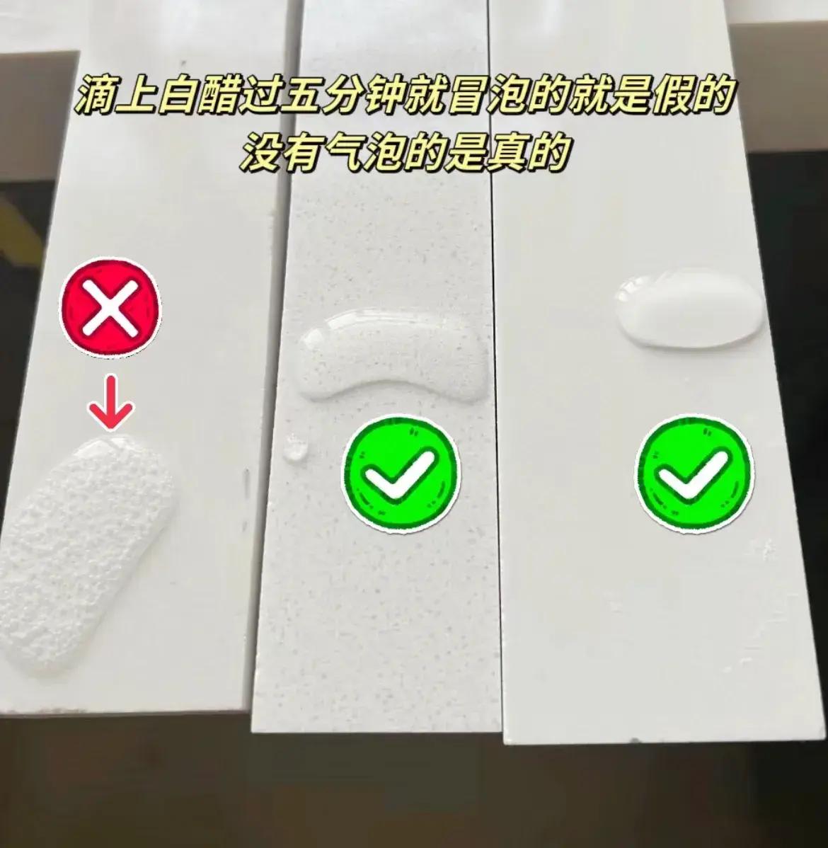 用醋或草酸溶液,滴到石材上,有氣泡的是崗石,前文裏說過,崗石冒充的石英石,裏面會加鈣粉,與酸接觸後會發生反應,形成微小氣泡,平時在使用過程中,就容易發生腐蝕問題。
