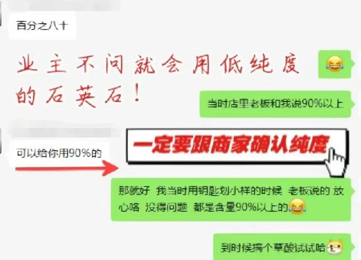 他們見多識廣又整天經手,對於材質的瞭解,可能都不用通過切割硬度、粉塵辨別,乍眼一看就能分清真假石英石,也正是多虧了他們提醒,我才知道我家廚房檯面居然連“石英石”都算不上。