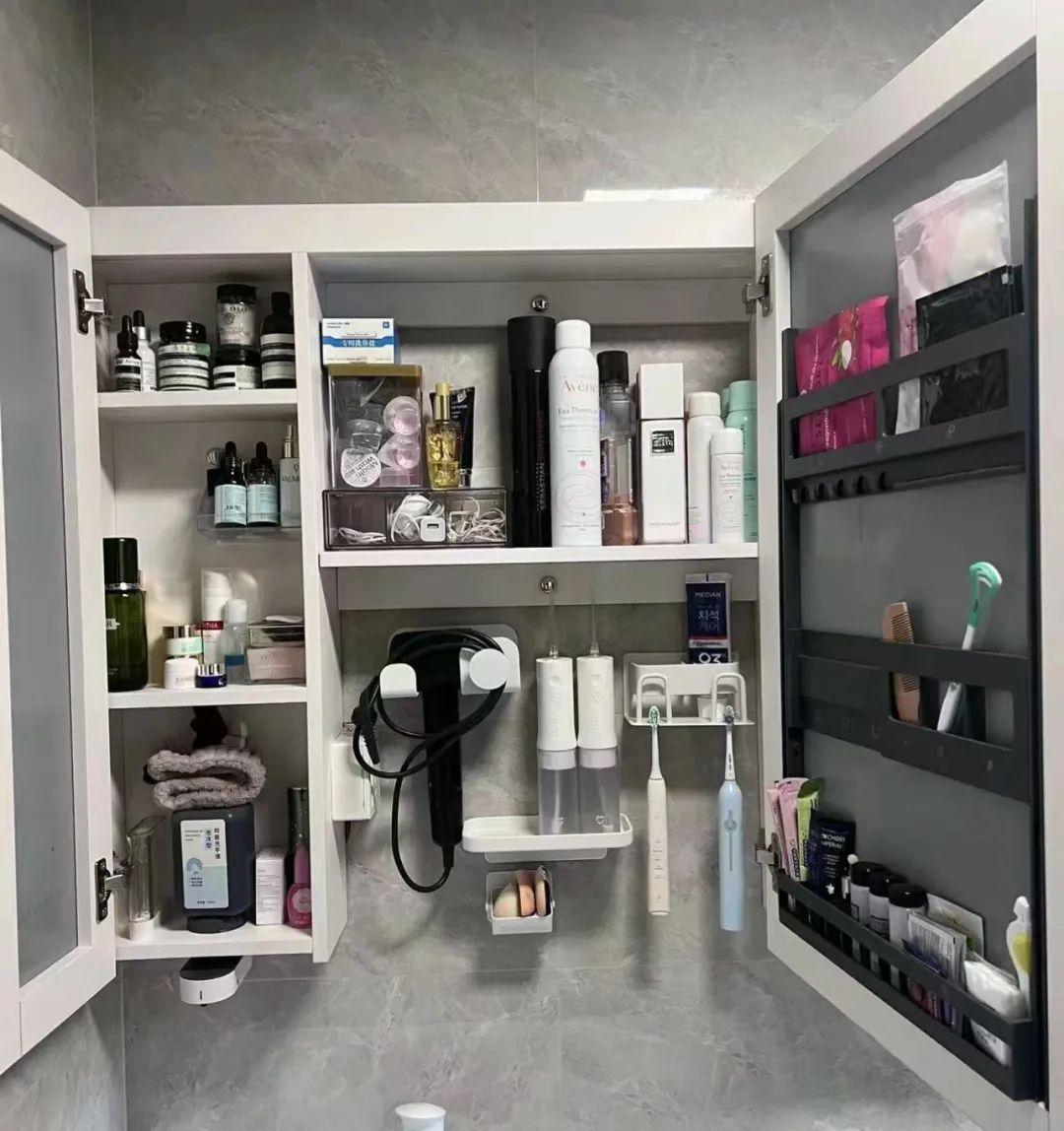 如果你家的洗手檯面積夠大, 可以放一個多層的收納盒,解放一點空間。但用了一段時間後你會發現,檯面依舊不整潔,而且清潔也很麻煩,因爲洗手檯是涉水位置,每天都有水漬濺出來,收納盒下面都是衛生死角。