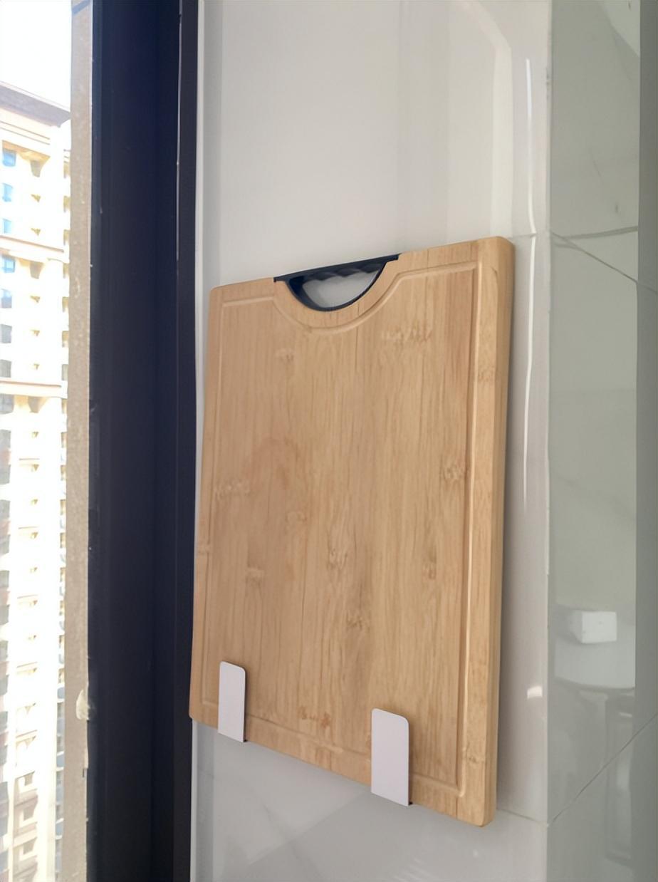 只需要兩個L 型掛鉤,用免釘膠粘在牆上,案板就能卡上去,非常穩固。如果牆面位置不夠, 還可以藏在廚房門後,這個位置通風,案板既不會發黴,也不會佔用料理臺牆面的位置。
