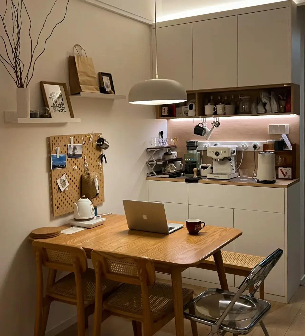 日用品能有序放在開放格里,一些不常用的小東西放抽屜,桌面東西少了,自然井然有序,餐邊櫃滿足各種收納需求。