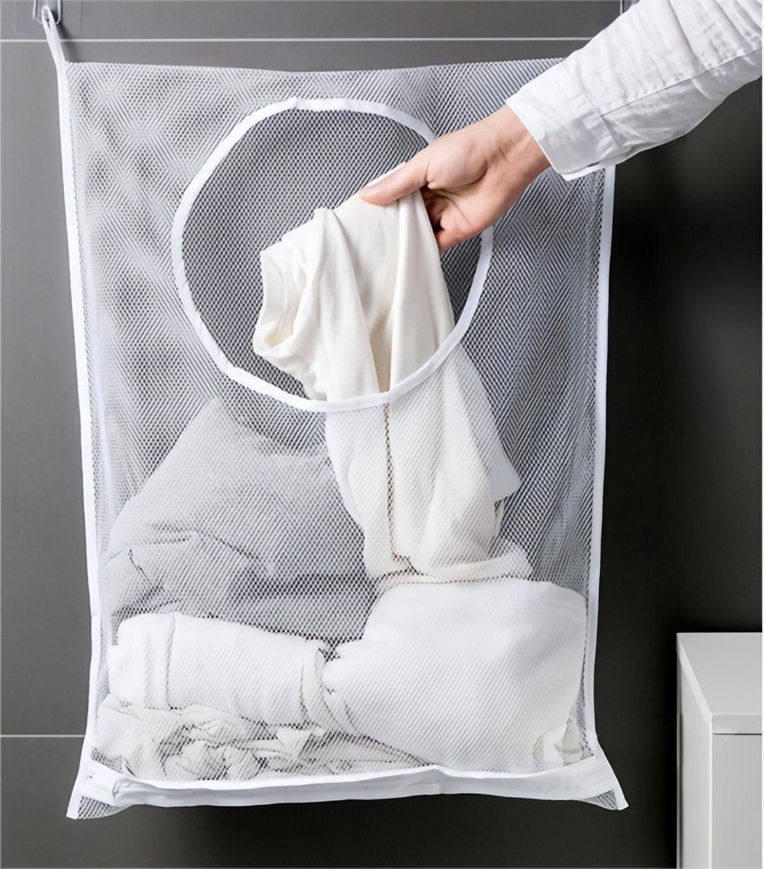 這種收納網體積很小,容量卻大,只需要用掛鉤粘貼在牆壁上,一家人的衣服都能放進去,網狀的材質透氣,即使存放時間稍長一些,也不會悶出異味。