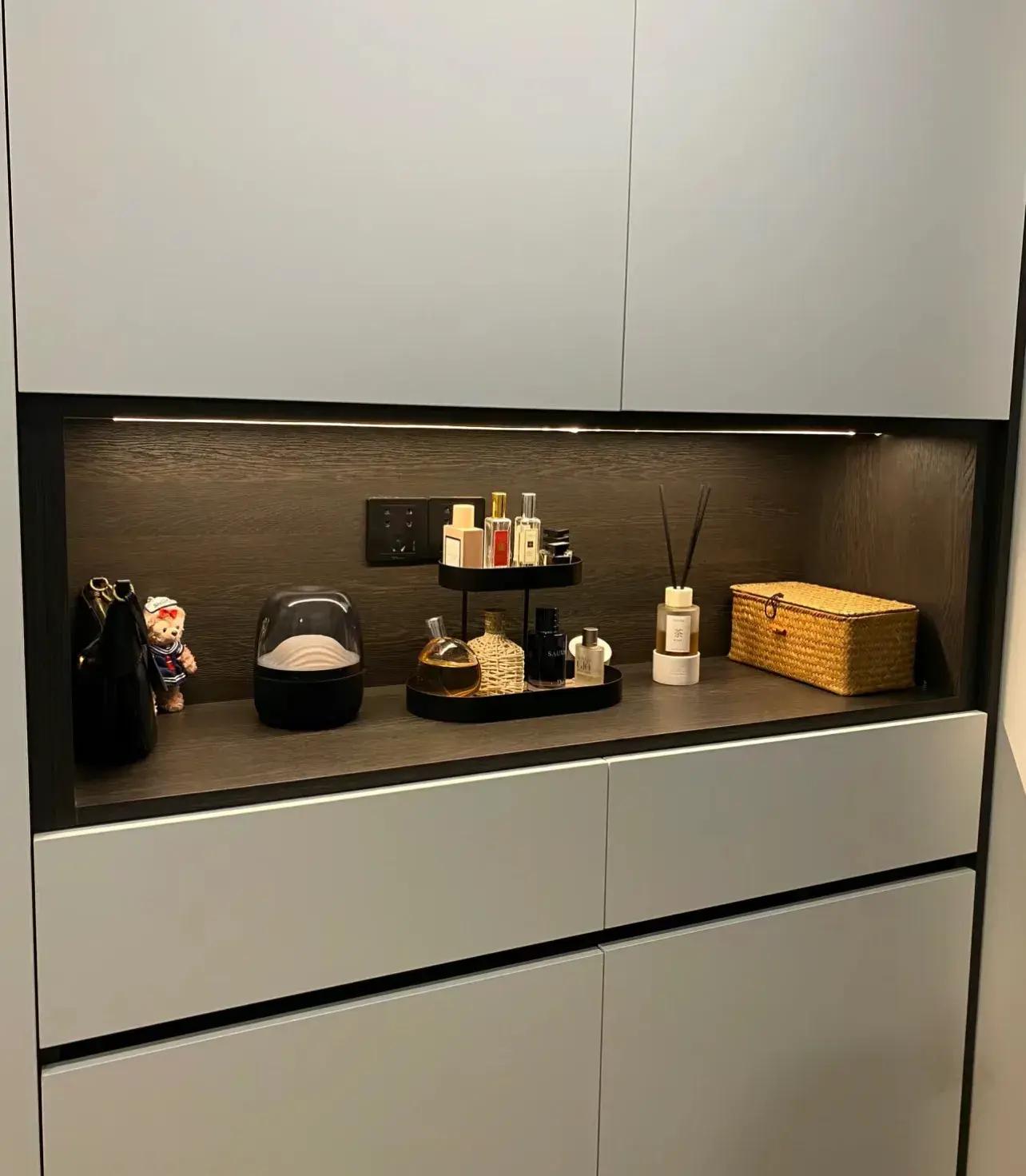 我們可以在玄關處的櫃子中間留出一塊開放格的位置,裝上感應燈,放這類常用品。