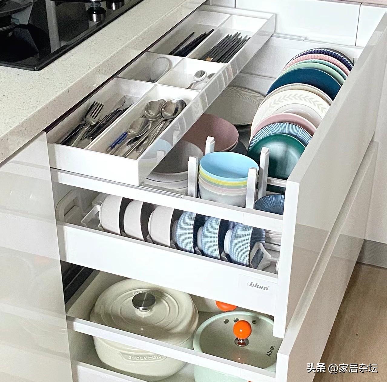 ①、靠近水槽旁邊的抽屜,建議大家設置成拉藍抽屜。這類抽屜用來放碟子碗,每次洗完碟子碗直接放進去,很順手。