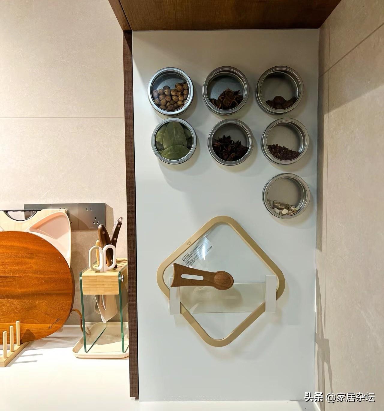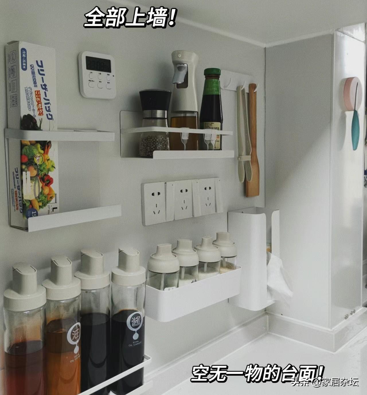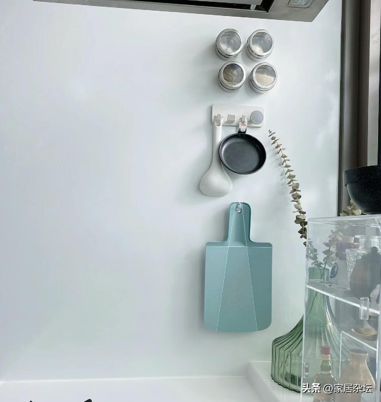 所以,我們就可以通過琺琅板和磁吸置物架,解決廚房檯面大部分的收納問題。