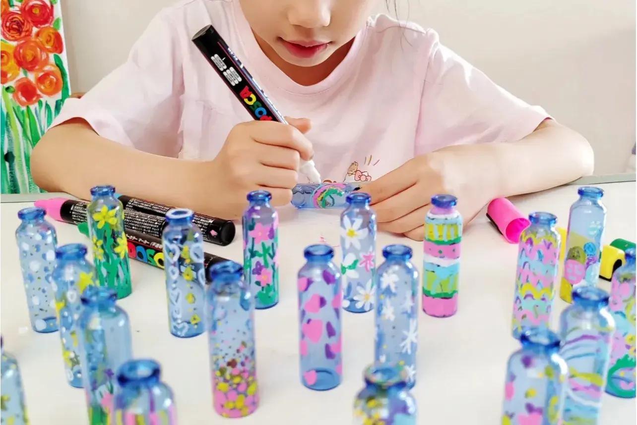 第二步:用彩筆給瓶子,畫圖案,交給小孩就行,這籃底的瓶子怎麼畫都不會醜;或者也可以像上面花瓶一樣,貼貼紙、亮片……