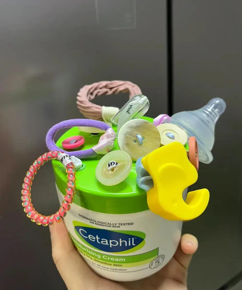 然後,你需要找一些絲帶,蛋糕上一般會帶,再找一些想扔沒來得及扔的小物件,奶嘴、皮筋、釦子……都可以,用絲帶給它繫上。