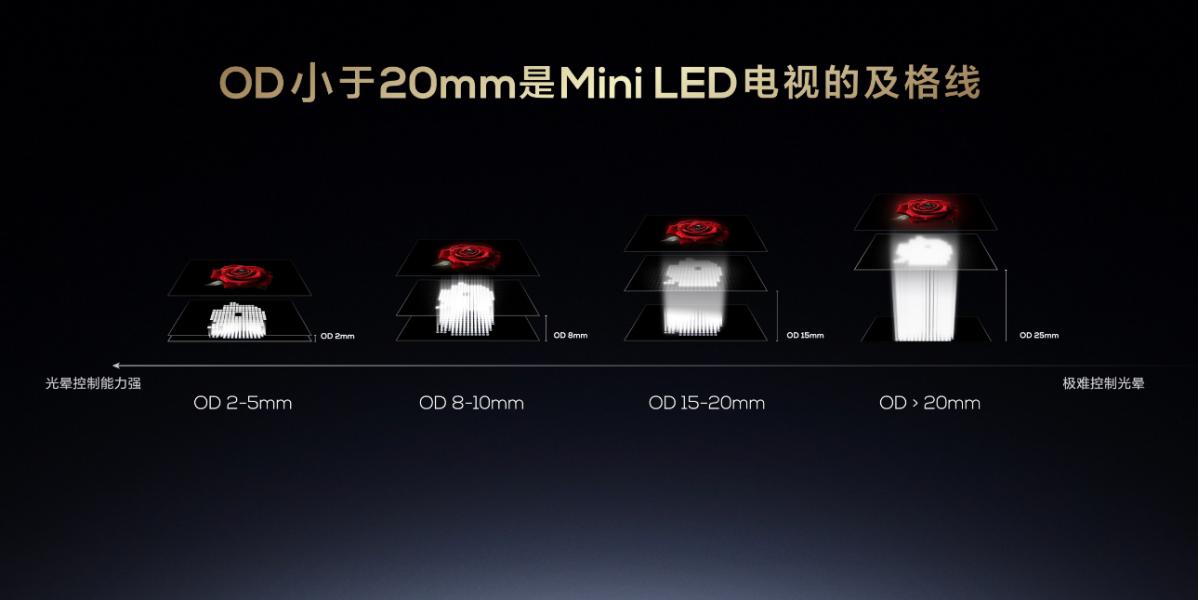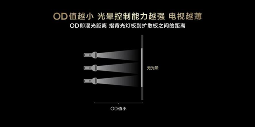 簡單來說,OD就是電視“肚子”裏的空間大小,專業上指背光板到擴散板之間的距離。OD值越小,自然意味着距離越小,發光面就越聚焦,與規劃分區大小越匹配,光暈控制能力也就越強,畫質表現也就更優秀,同時電視整機可以做得更薄。