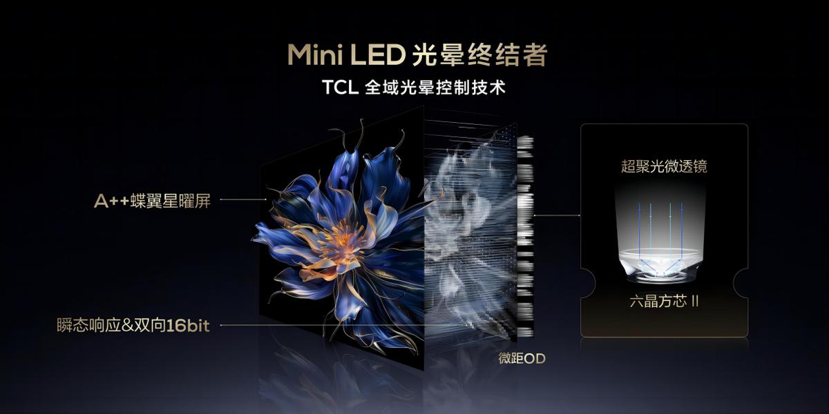 有時候看普通電視,畫面邊緣會有那種模模糊糊的光暈,真的很煩人。爲了解決這一問題,TCL X11H電視採用了TCL全域光暈控制技術,這項技術是24年TCL主打的核心科技,本質上就是消除光暈,還原清晰畫質。不止以上介紹的微距OD,還融合了六晶方芯II、超聚光微透鏡、瞬態響應和雙向16bit、A++蝶翼星曜屏等科技,覆蓋了從光線產生到成像的整個過程,光暈問題統統解決,難怪穿幫鏡頭都一點藏不住!