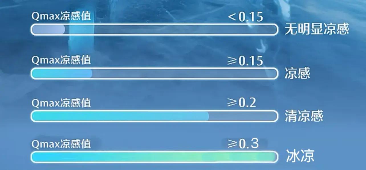 ②涼感係數Q-max(單位爲[J/(cm²·s)],國標GB/T35263-2017(接觸瞬間涼感性能的檢測和評價評)中針對涼感材料接觸瞬間涼感的評價值)