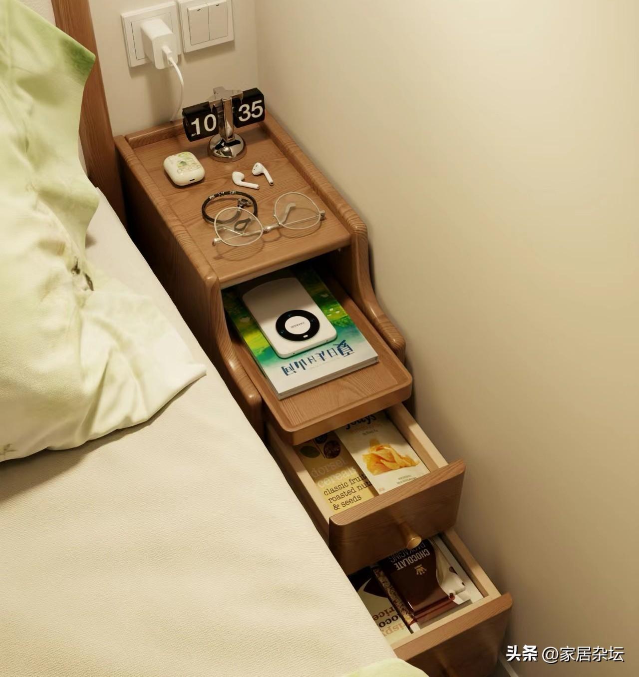 ①、寬度小,幾乎不佔用臥室的空間。30釐米的牀頭櫃貼着牀,幾乎所有的家庭都可以擺放得下,就不擔心放不下的問題。