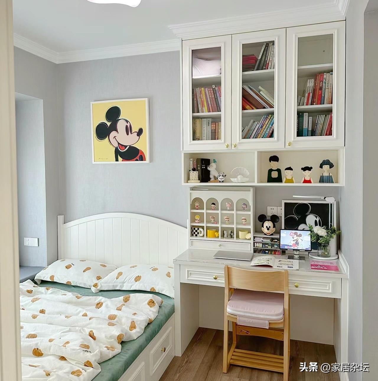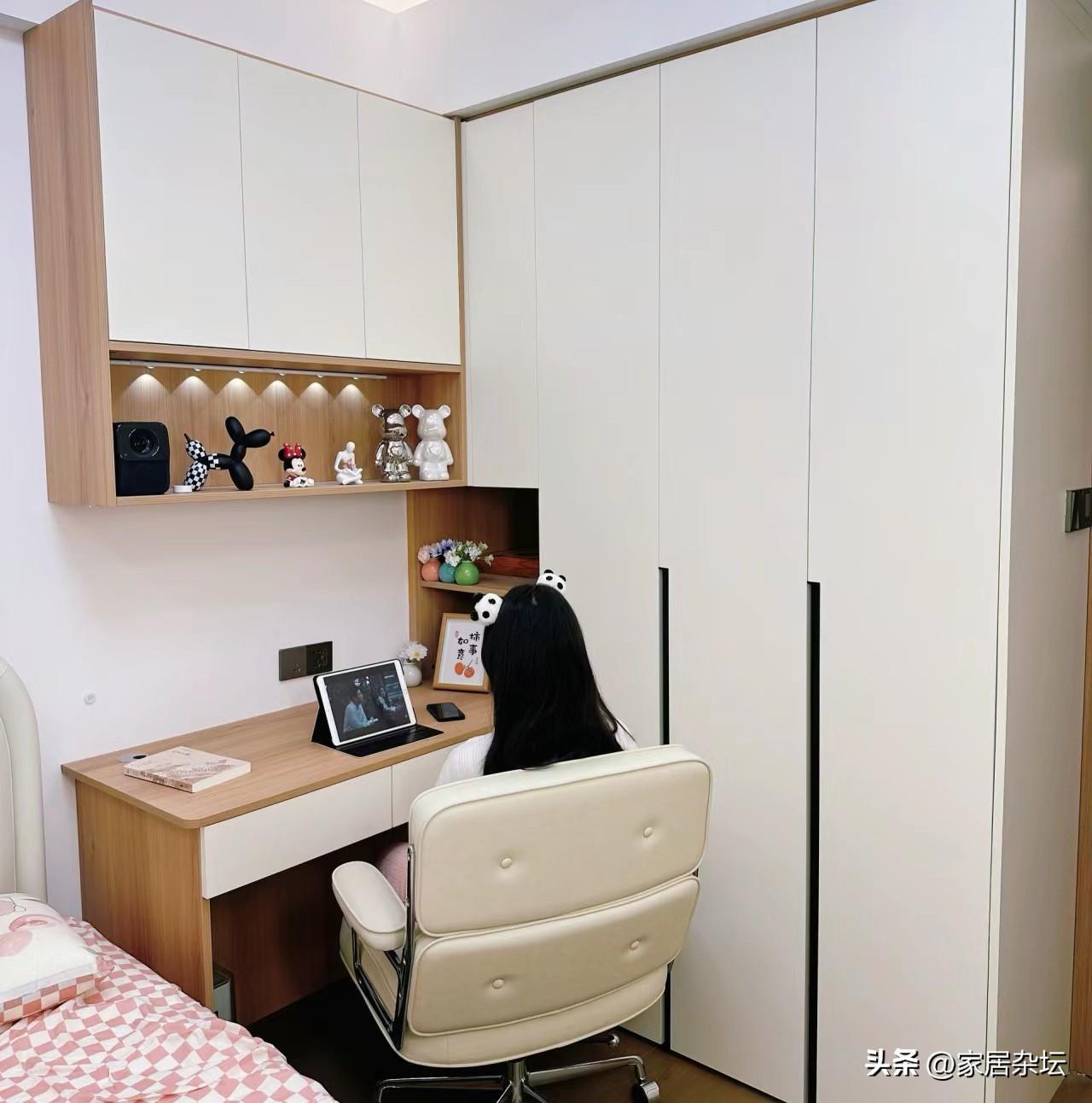 ③、書桌的上面,建議大家做到頂的書櫃。書櫃的最上層,做成封閉式的櫃門,放一些平時不常用的物品。而下面一層,做敞開式的收納格,放一些平時用的物品。