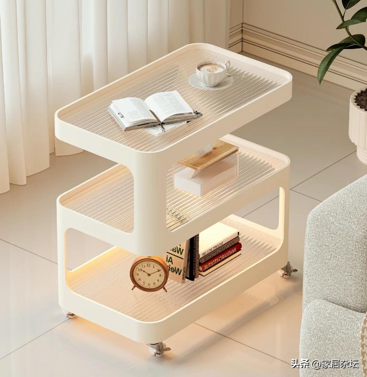 或許我們會擔心茶几上物品的收納,那麼大家來看看這位朋友家的做法,就是在沙發的旁邊放了一個多層收納小邊幾。