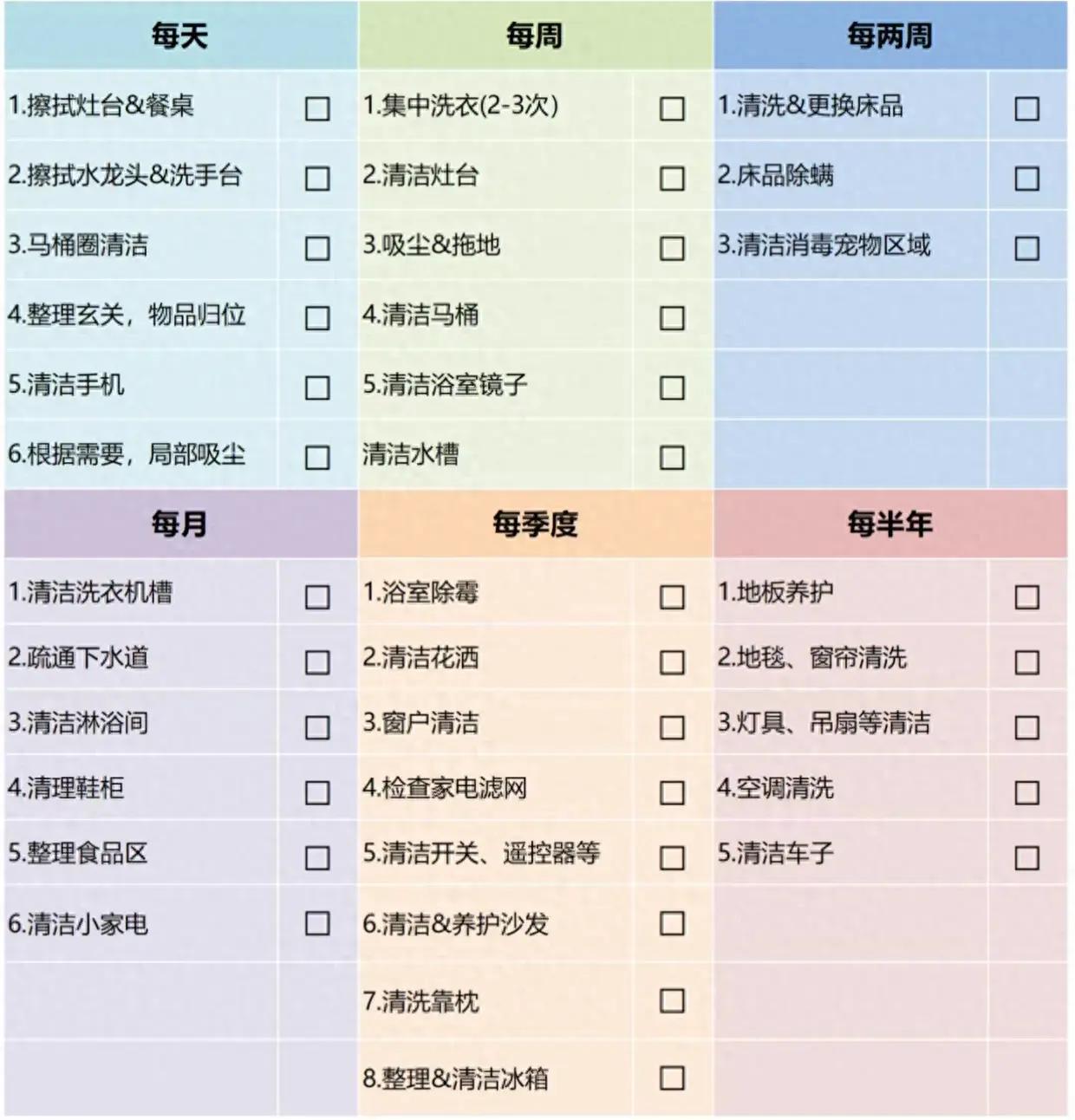 行動更有針對性,忙時,可以只做每天的家務事項,閒時,可以去做每週、每月、每半年的一次的家務,讓家裏更乾淨。