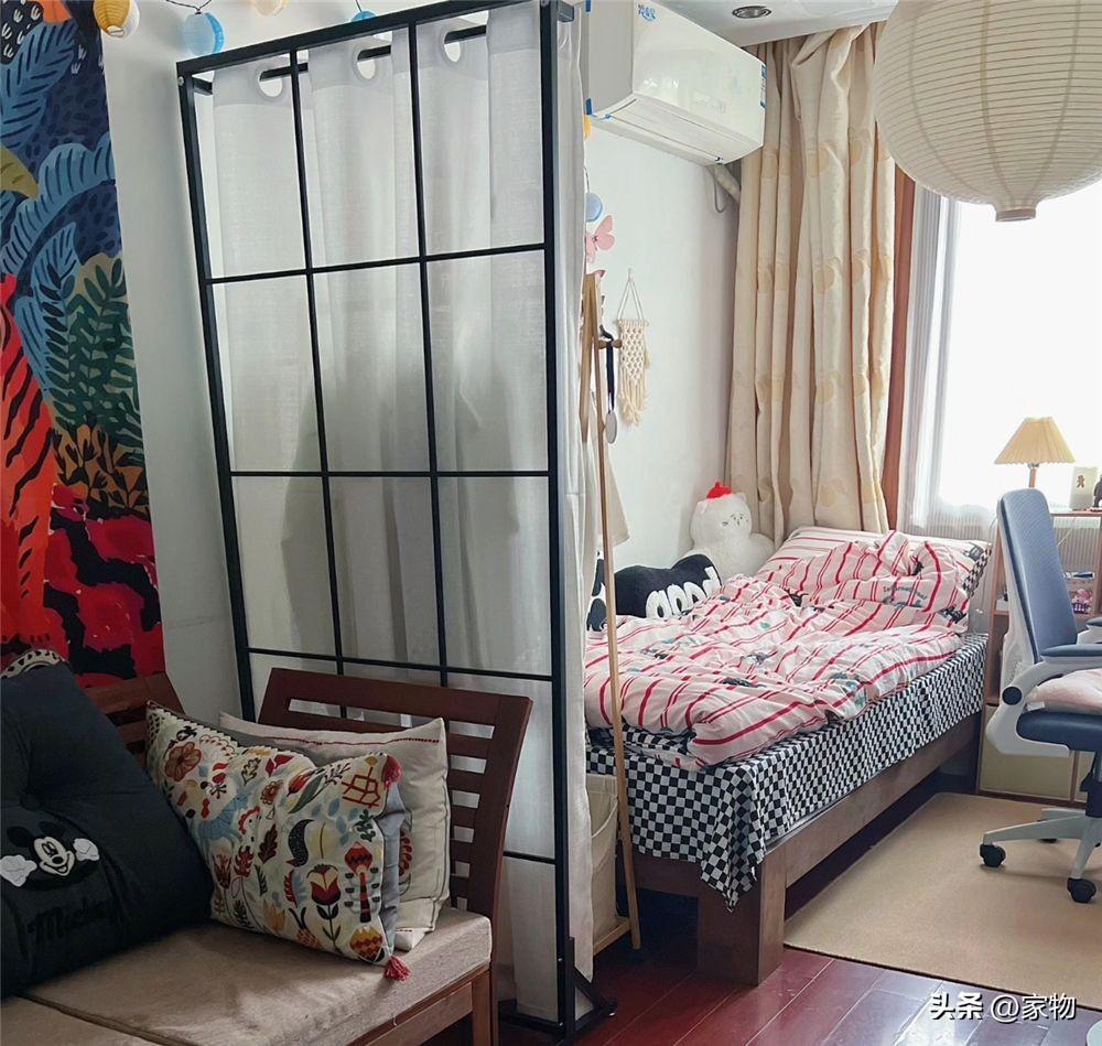 這位姑娘(@橘子汽水)的家,是一間一室一廳的老破小,客廳本身也不大,只有11㎡,但她卻利用兩扇屏風,將客廳一切兩半,靠窗的位置做成了迷你臥室。