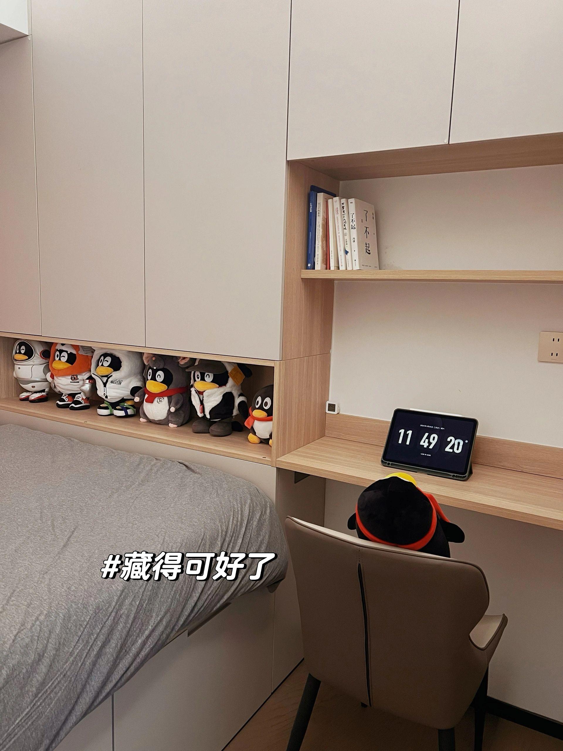 她家的客房定製的榻榻米平時看就是這個樣子,牀連着書櫃,連着書桌都是一體式定製的。