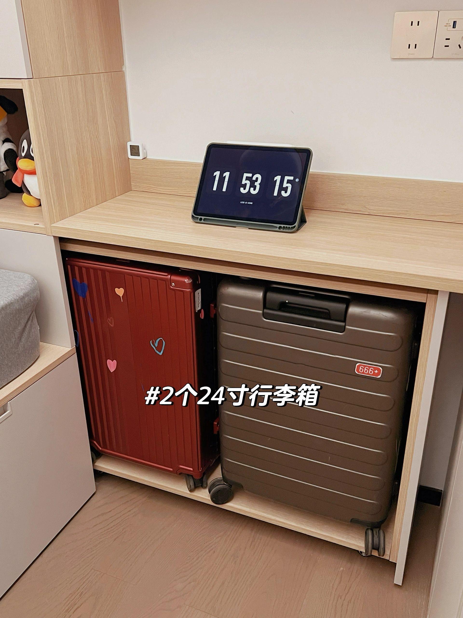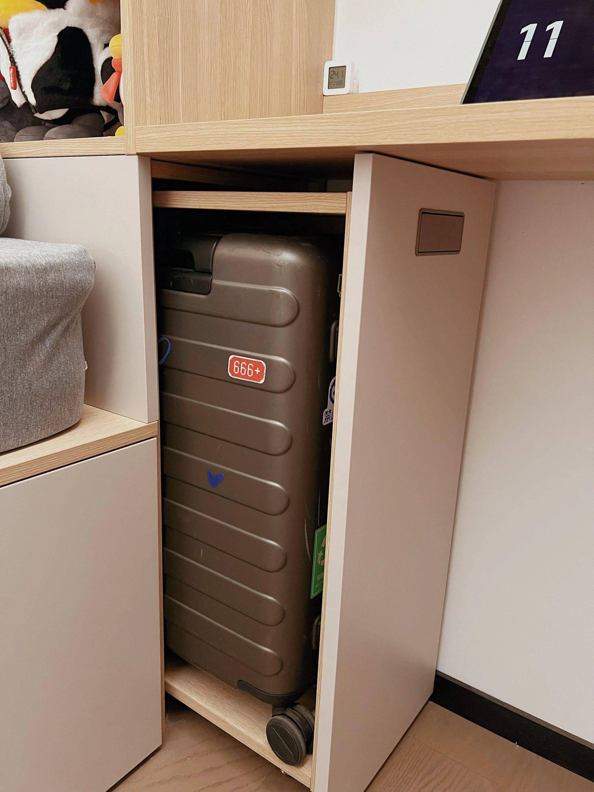這裏設計了一個底部帶有腳輪的縱向抽屜,抽出來後,裏面剛好放入2個24寸的行李箱。而且抽拉的空間正好也完美利用了書桌下面的面積。