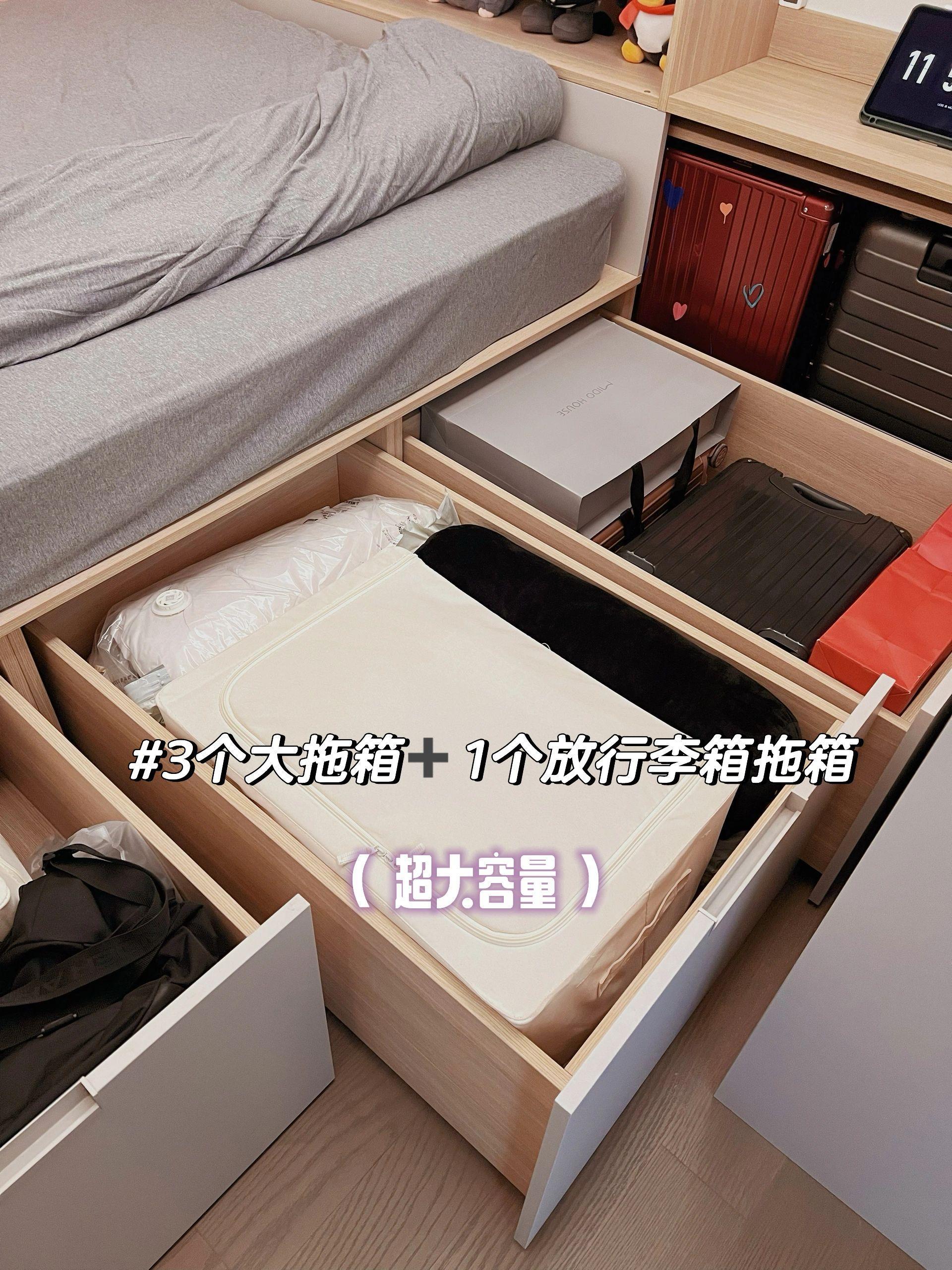 牀下也設計成了抽屜的形式,三個大拖箱,居然還存着一個行李箱,以及一些工具箱、雜物箱等物件,收納功能爆棚,整潔大氣,關鍵存取行李箱也非常的方便,get!