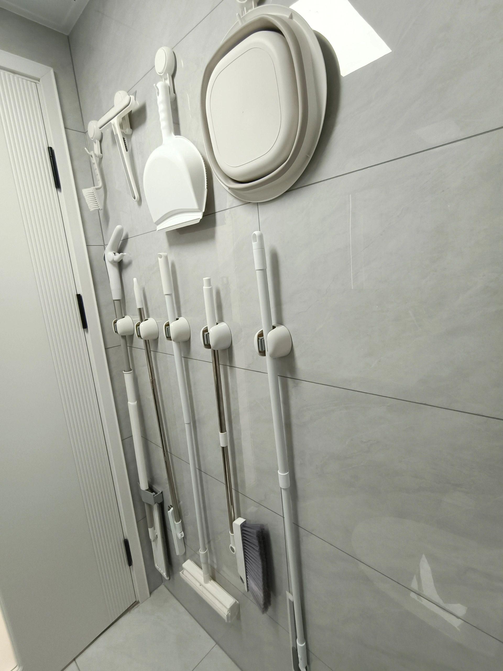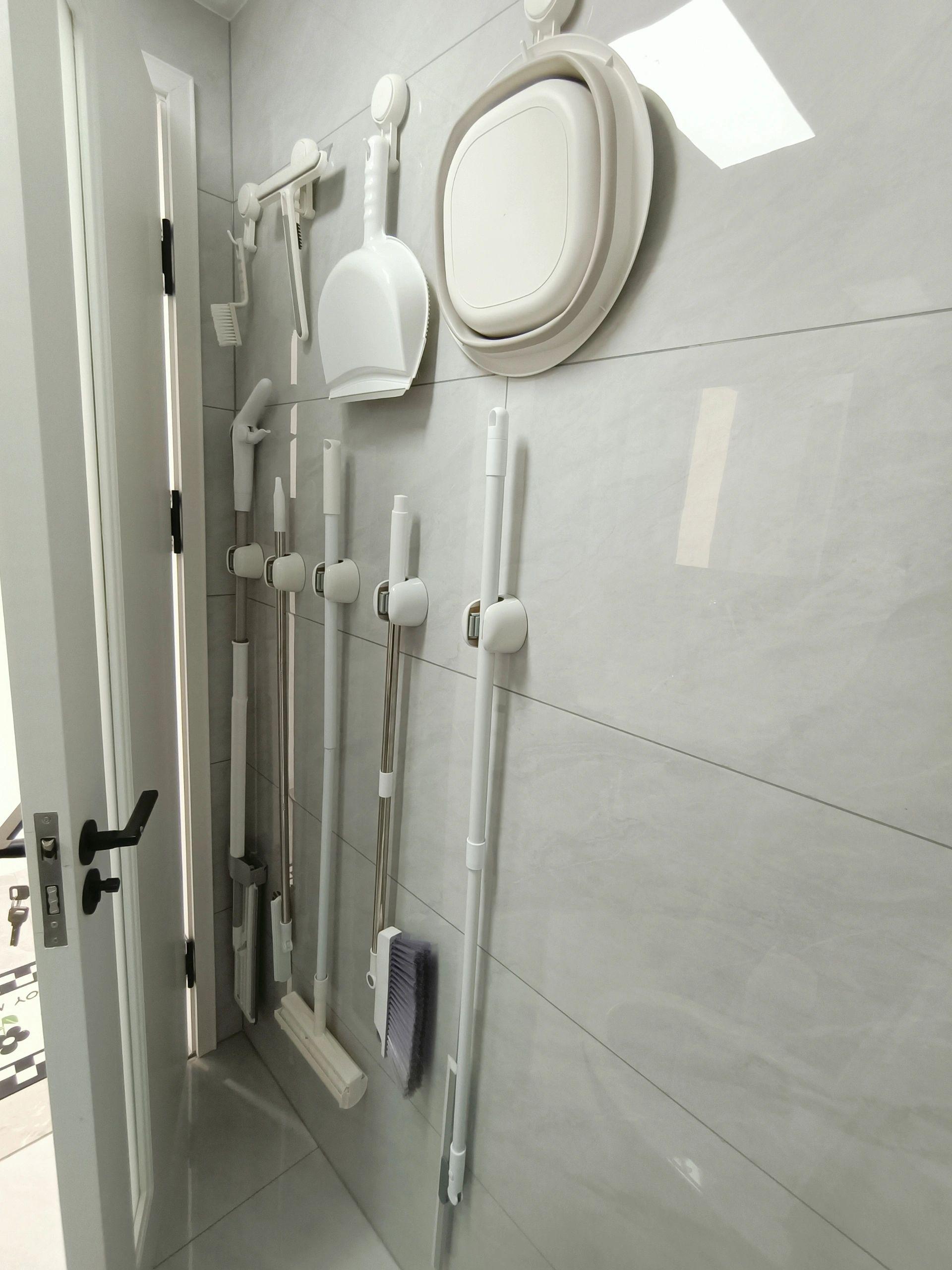 下半面牆,安排免釘“拖把夾”。上半面牆,安裝四個吸盤掛鉤。