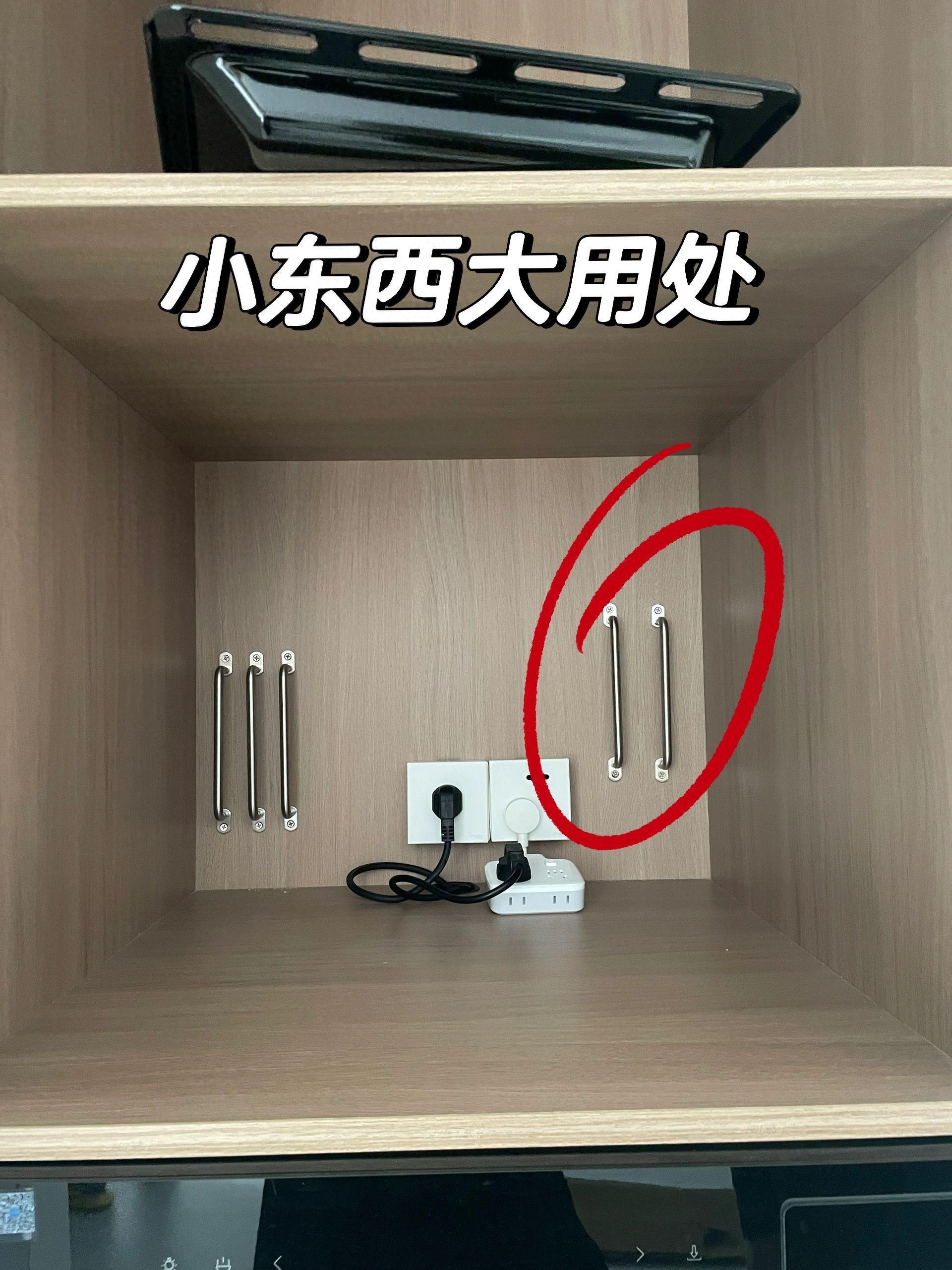 它直接利用了嵌入蒸烤箱上方的一格櫥櫃,再把家裏之前裝櫃子買多的門把手,用螺絲固定在了櫃子的背板上,這樣就改造了一套“立式收納區”。