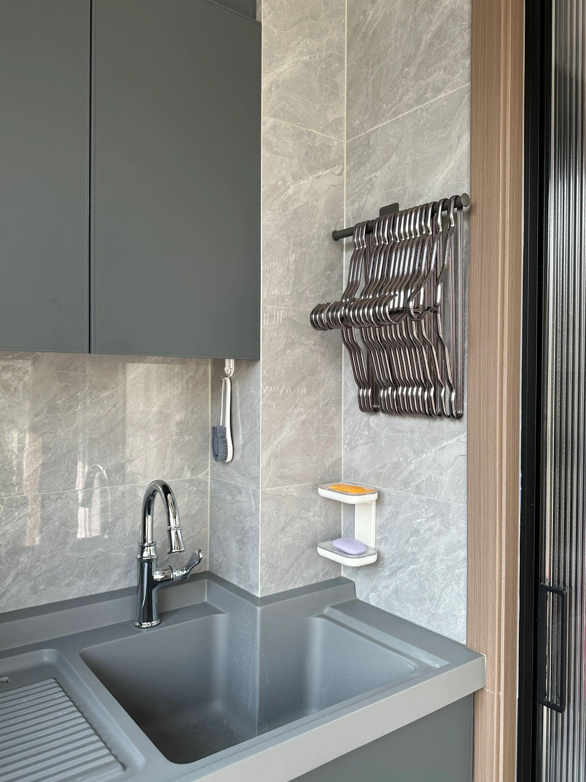 她用一個簡易的免釘毛巾杆,就解決了晾衣架的收納問題,正好可以安裝在陽臺洗衣池旁邊的牆面上。一個如果不夠的話,可以上面再加一個,不單單是整齊,最關鍵的是用着順手,晾衣服隨手取,收衣服隨手掛,太便捷了!關鍵顏值還高。