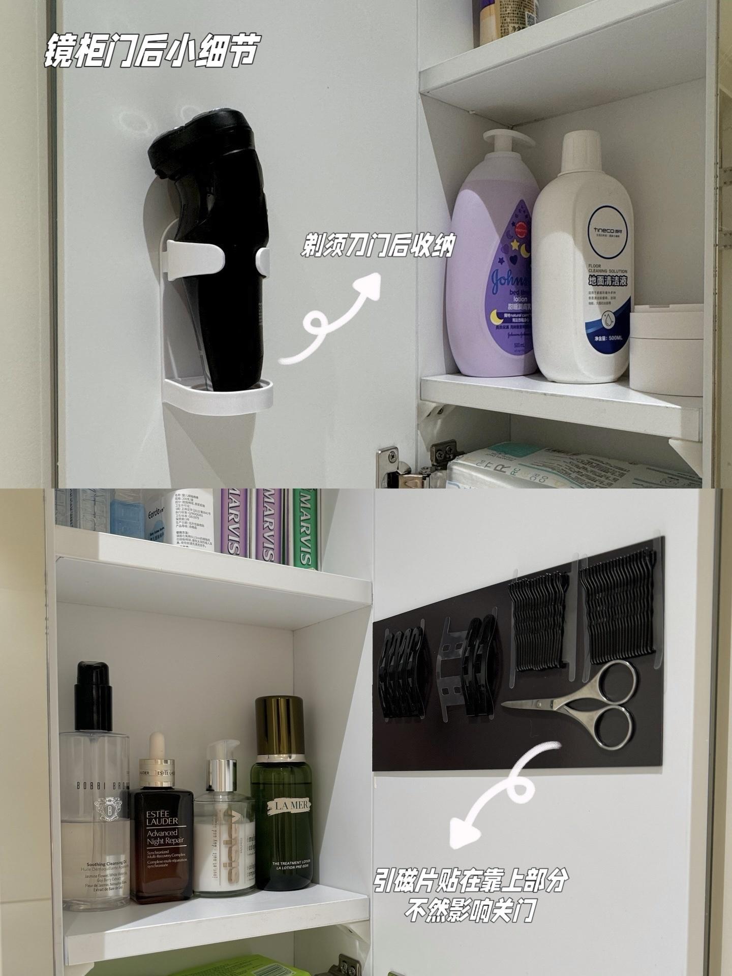 鏡櫃門的背後也不浪費,貼上了引磁片,像一些髮卡、髮夾、修鼻毛的小剪刀都是鐵質的,可以直接吸在上面,完美利用空間,而且整潔乾淨,取用特別順手!太絕了!