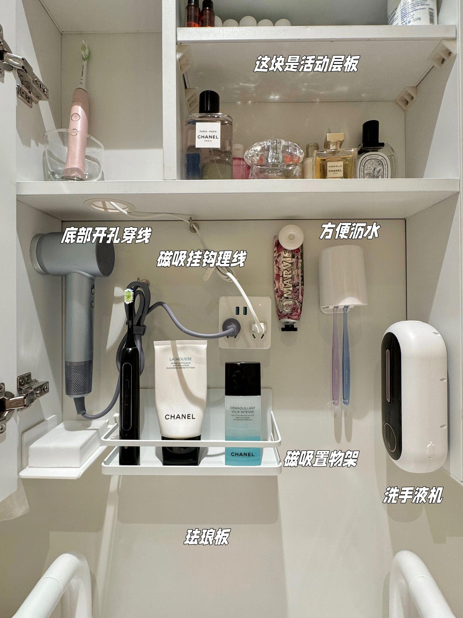尤其是洗手液機,關上櫃門時也被完美隱藏了,因爲沒有底板,手伸下去就能自動出液特別方便。並且還預留了插座,可以給常用的吹風機通電,或給常用的電動牙刷、剃鬚刀充電。