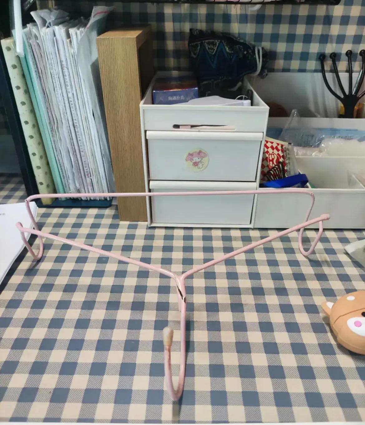 說是做的,其實就是把兩個衣架拉寬、底下綁起來,這樣做的目的是靈活固定,哪怕是厚枕頭,寬抱枕,也能放進去晾曬,包括毛絨玩具。