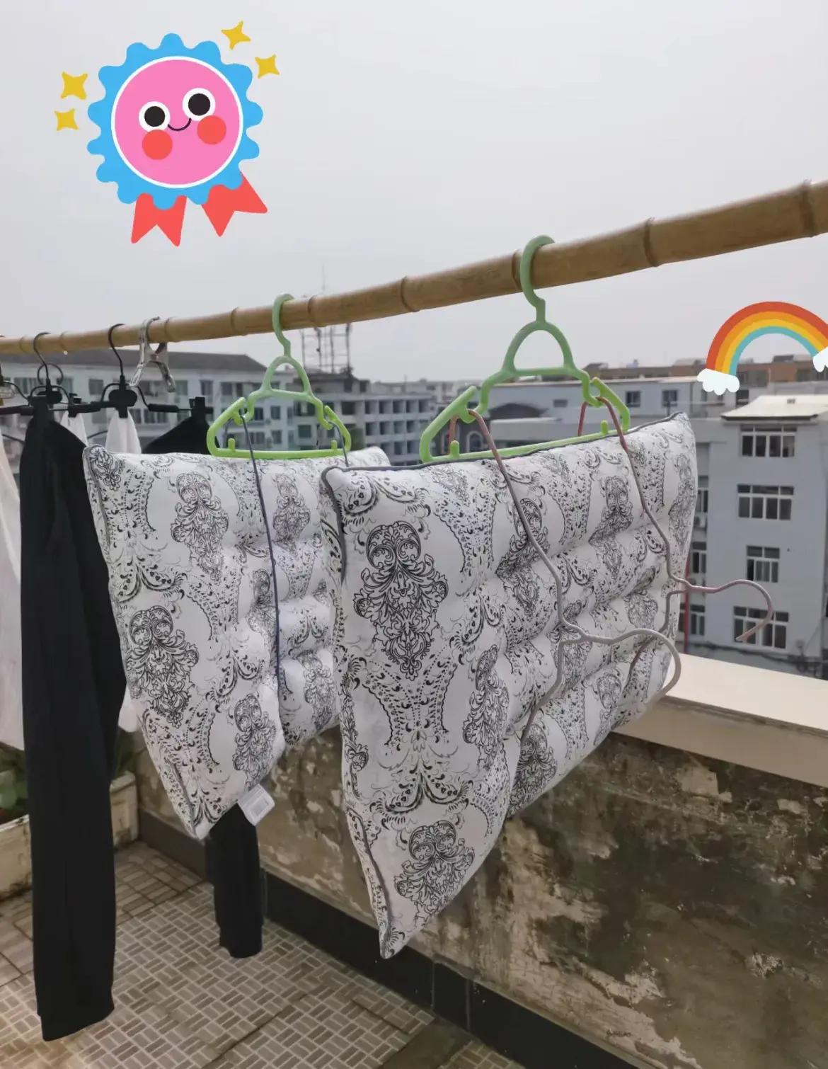 原本是拉個凳子放陽臺上,後來嫌麻煩,索性就用舊衣架做了個專門的枕頭晾曬架。