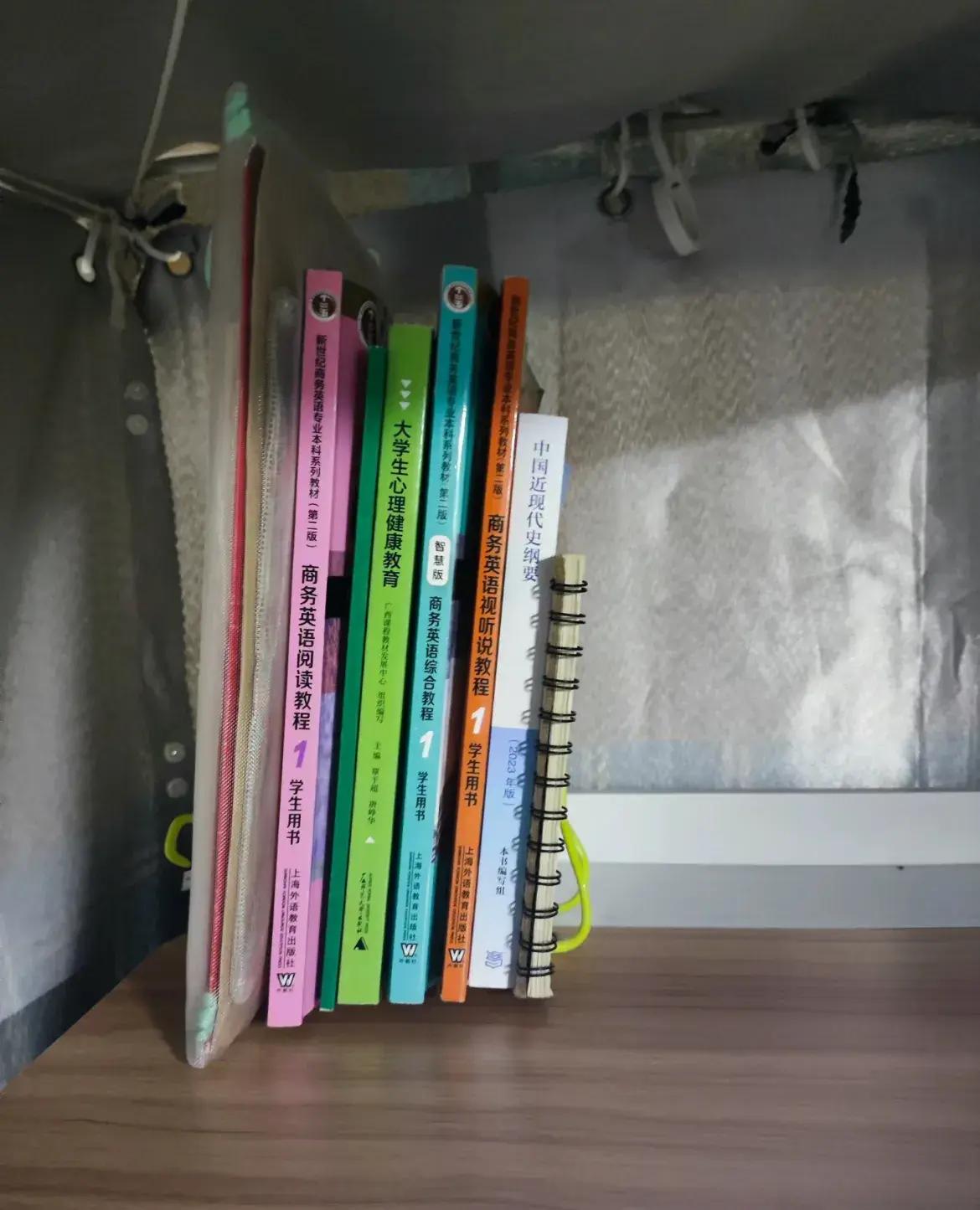 正如上圖,只有幾本書,又想讓它很規整的立起來排列時,就用舊衣架,折成一個“小孔雀”,前面是頭,後面是尾,中間的空隙用來放書本。