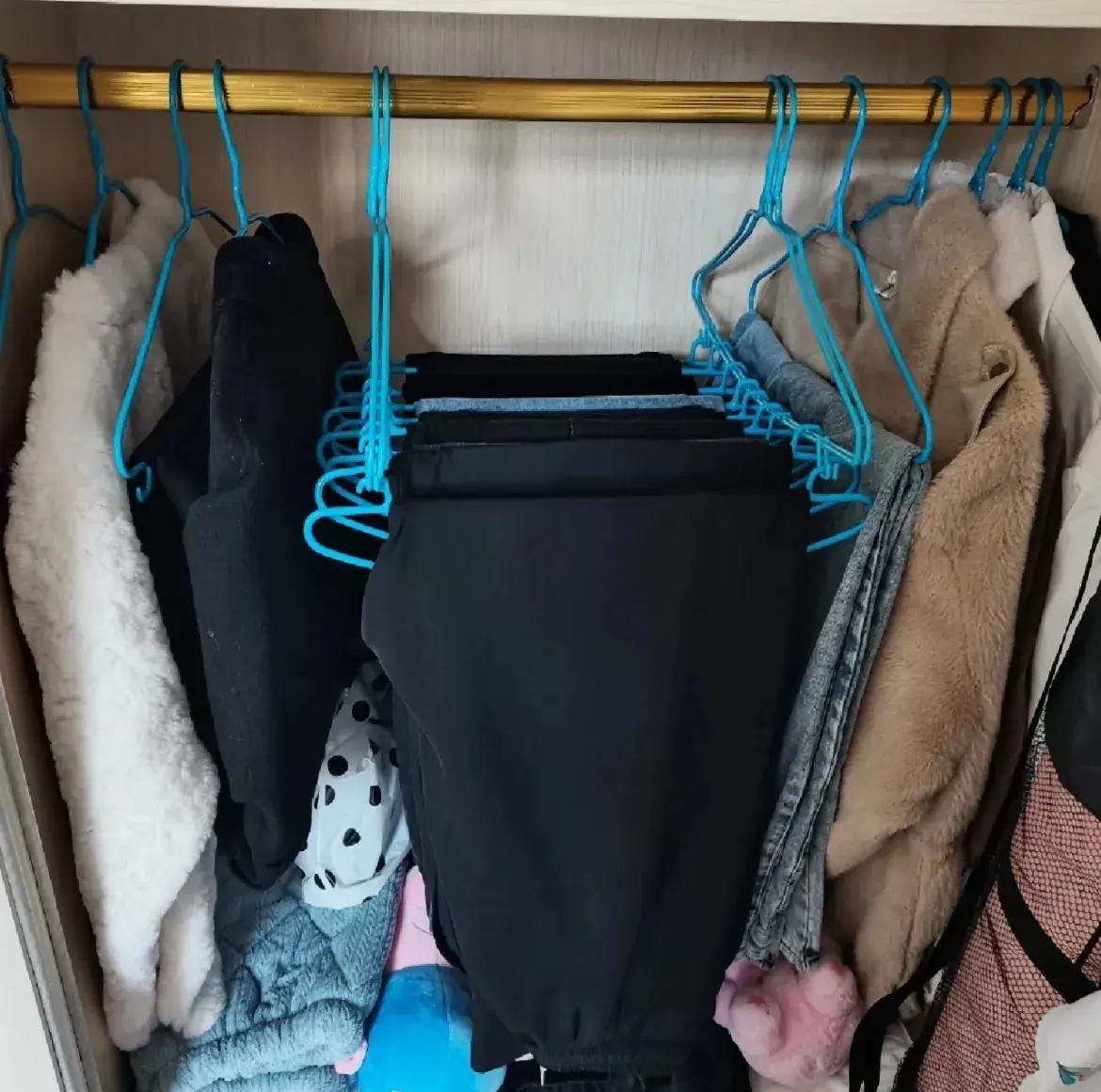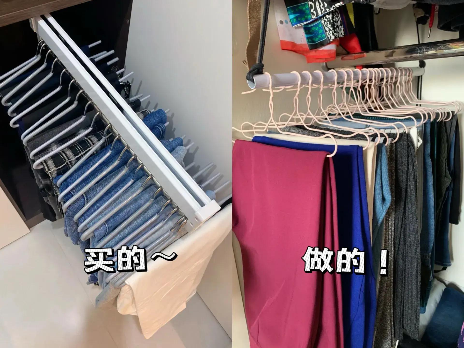 真是驗證了那句強者從不抱怨環境,將繩子綁在衣櫃上層掛衣杆上,在下層掛杆的位置,穿過一根衣櫃深度的空心管,然後縱向掛上褲子。