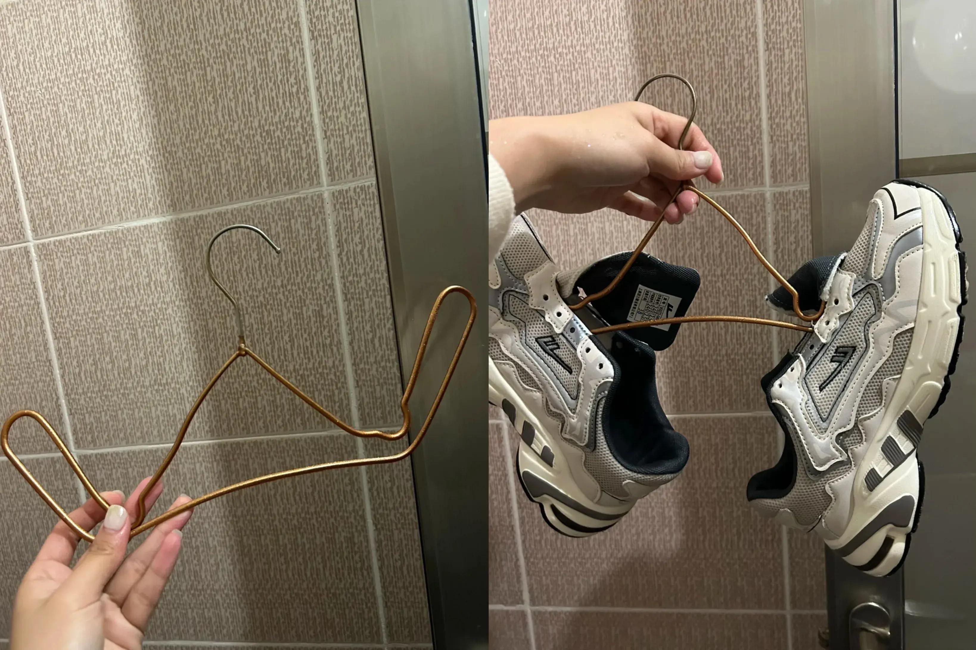 方法也簡單,兩邊向上折到能把鞋子掛起來的角度就搞定啦~