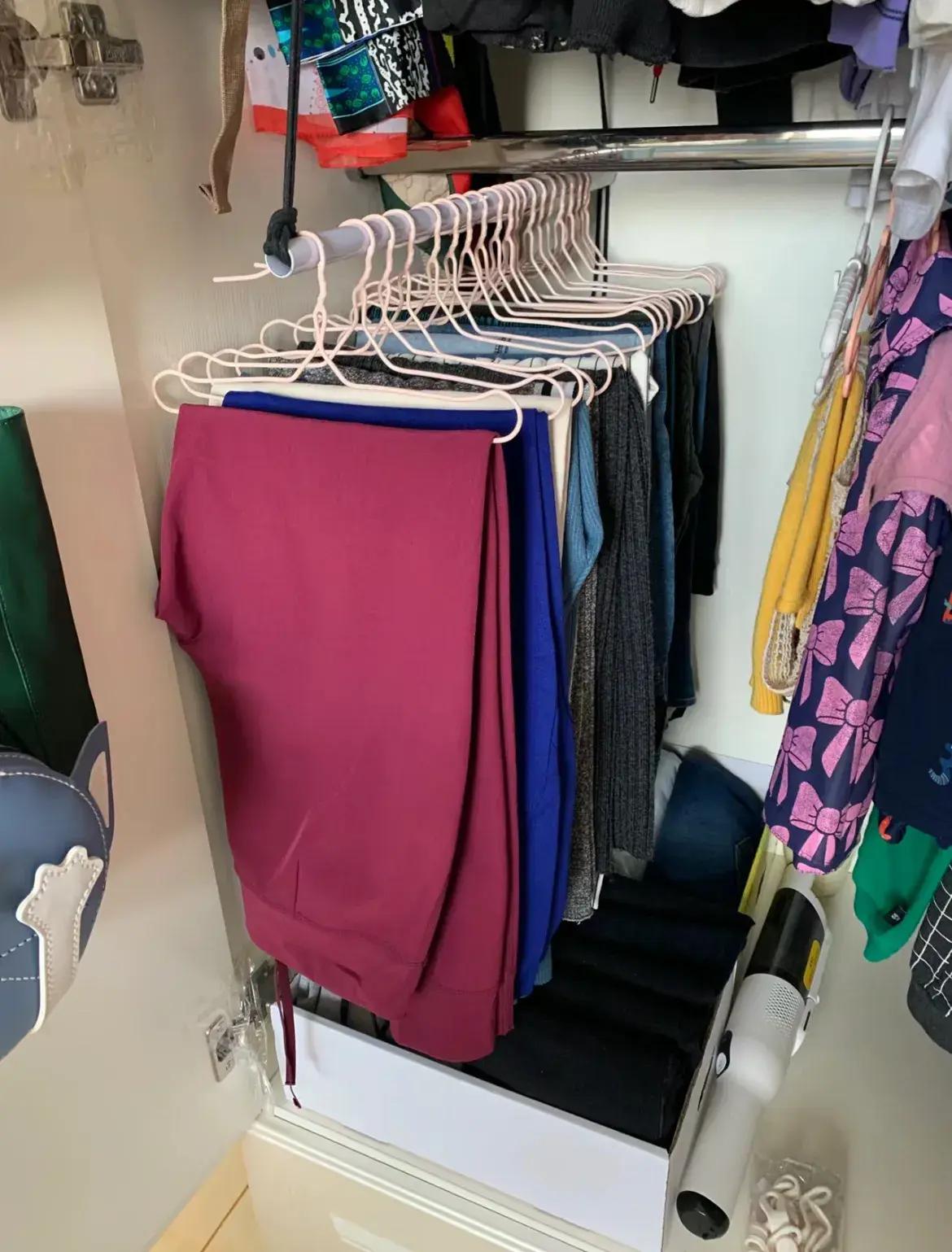 如此一來,僅用一個褲子的寬度,實現了很多條褲子收納不說,最主要的是,繩子是靈活的,拿取最裏面的褲子,拉動杆子,就跟滑軌褲架一樣,超級方便。