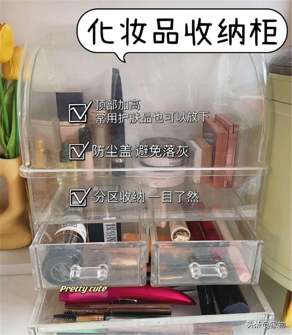 梳妝檯的檯面,我一般都會準備上一個化妝品的收納盒,而且必須是透明的,可以將檯面上散亂的化妝品集中收納在一起,查找拿取的時候也很方便,另外,也避免了積灰落塵,何樂而不爲呢?
