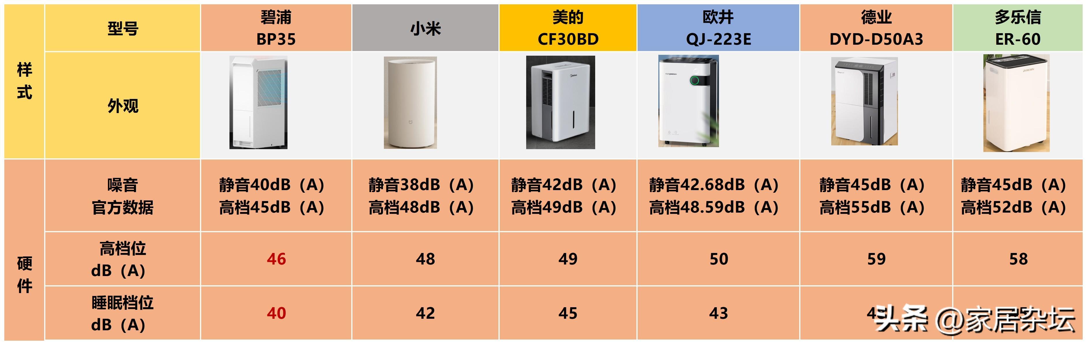 當然因爲多樂信和德業都是大容積,而且額定功率都在500W以上,噪音自然會比較大,但是睡眠檔位還能接受,反倒是碧浦和小米這次又形成了鮮明對比。