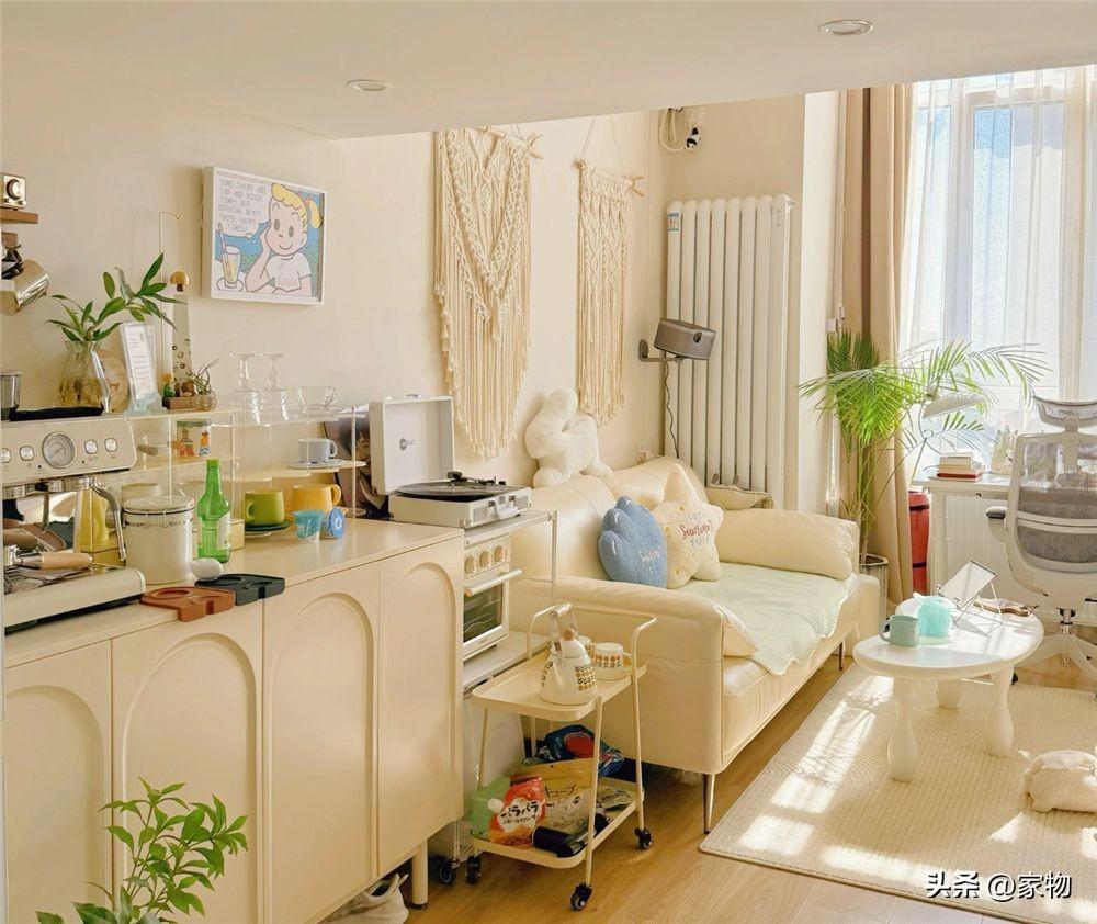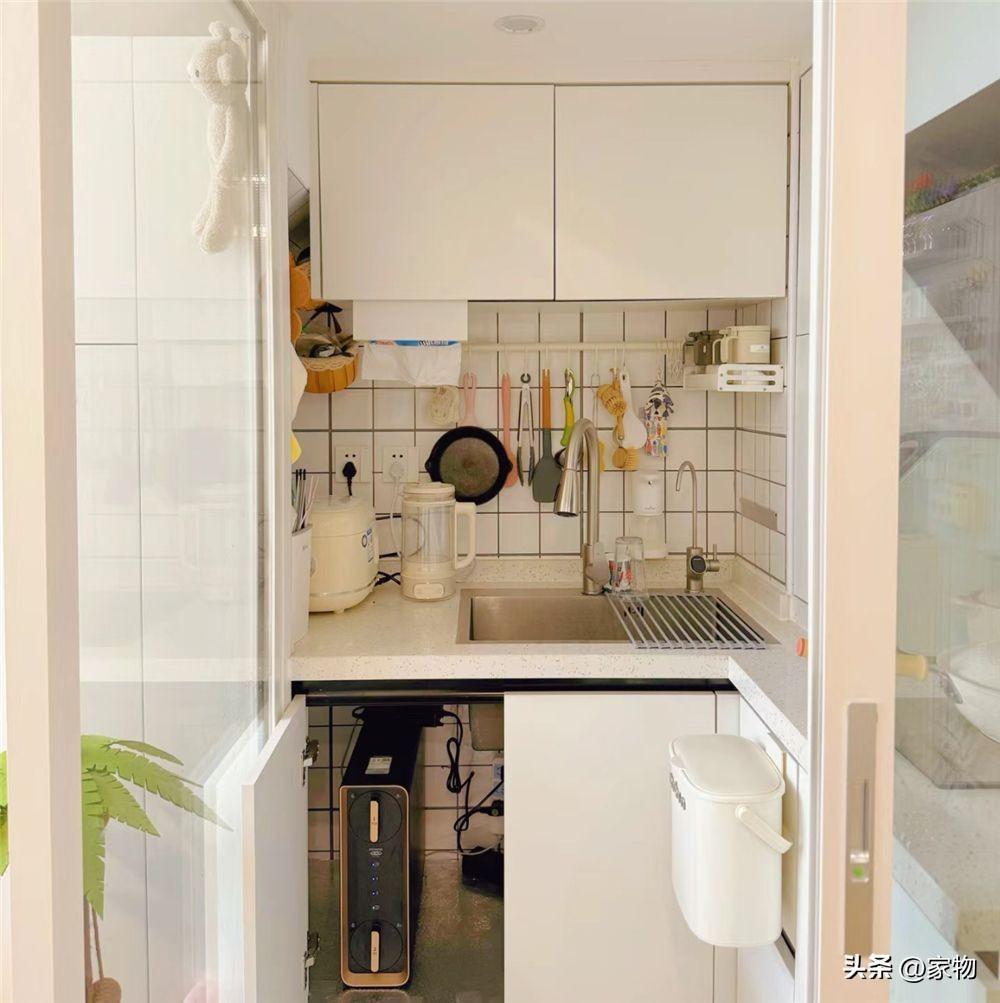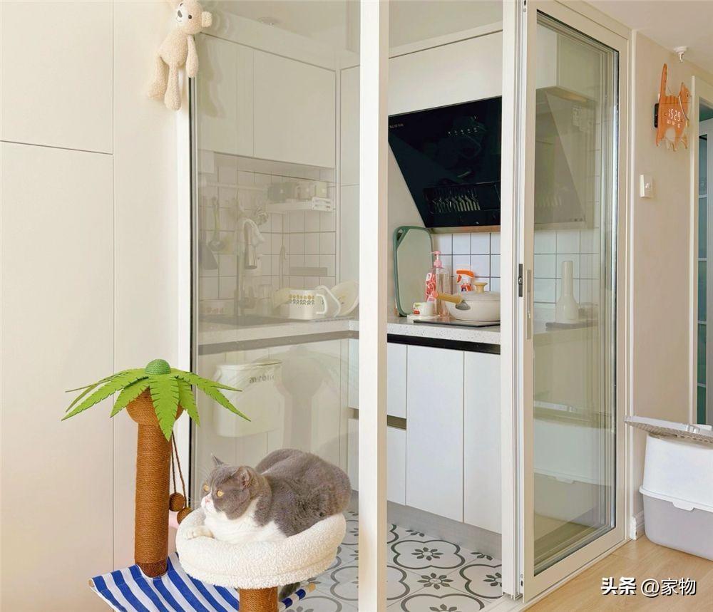留給廚房的地方其實並不多,既然沒有選擇做開放式廚房,那廚房就只能利用現有的空間硬塞下去——這位姑娘的選擇是用玻璃隔斷,隔出一個不到2㎡的小廚房。