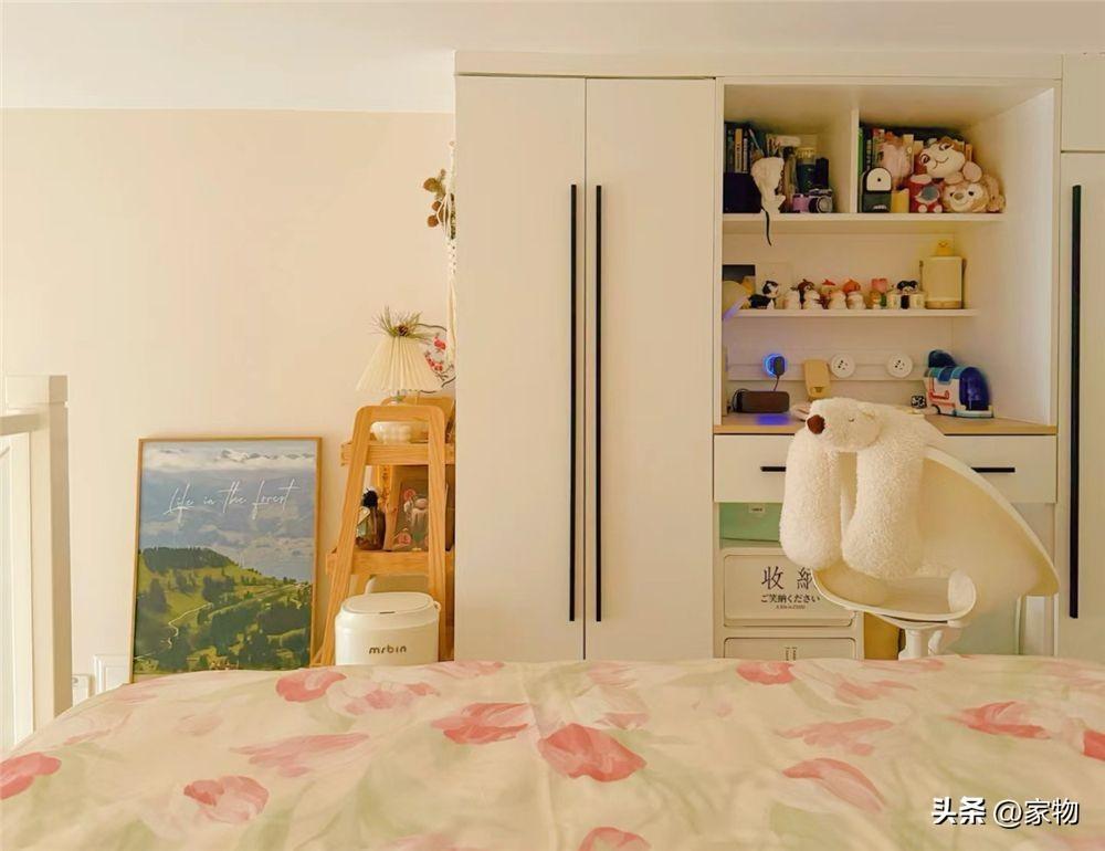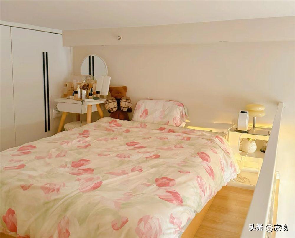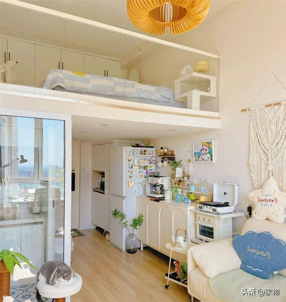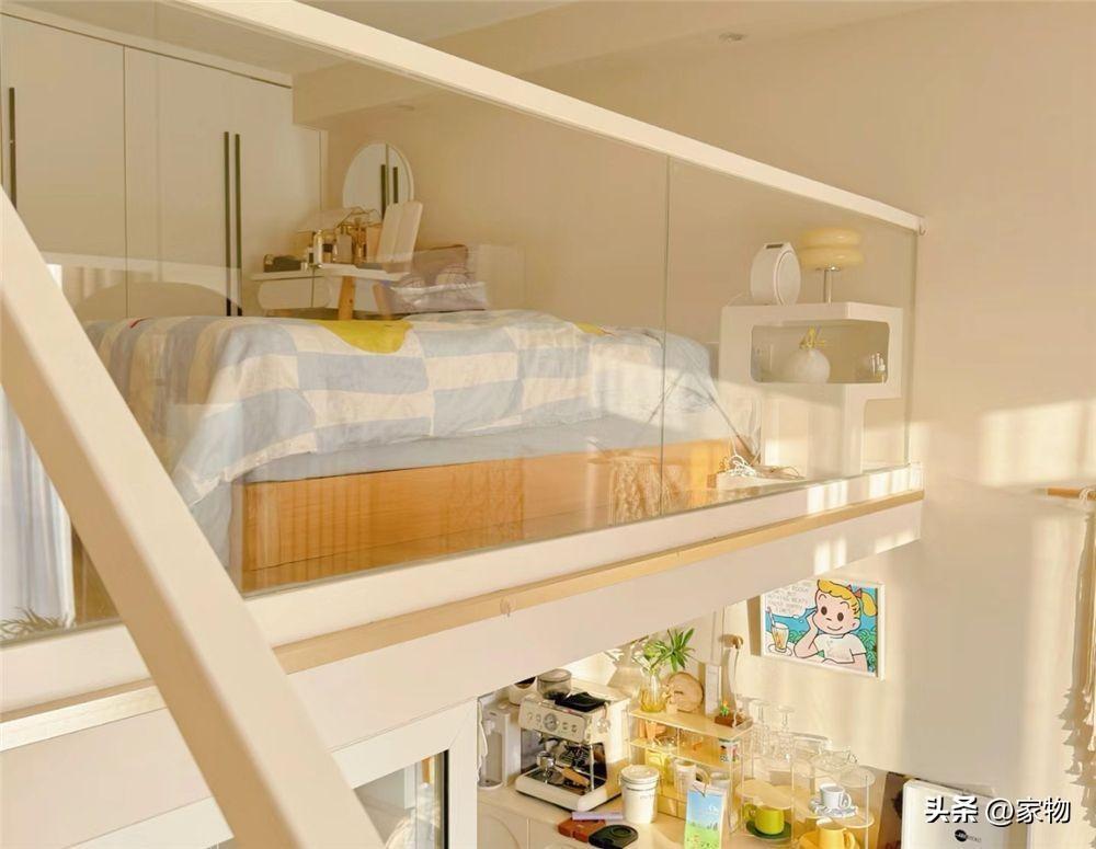 別看家裏蝸居的面積只有23㎡,但層高卻足足有3米7,她便利用起這層高的優勢,切出一間隔層臥室來,用玻璃當做臥室的護欄,也不會影響到採光和視野。