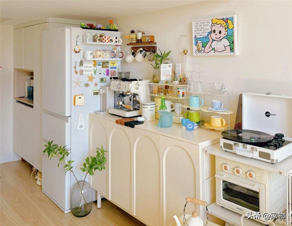 我個人還是挺喜歡冰箱旁邊這組櫃子的,拱形櫃門搭配上面你色彩各異的杯子,以及旁邊的小烤箱和唱片機,既看起來有種少女心,又有種隨性灑脫的感覺。