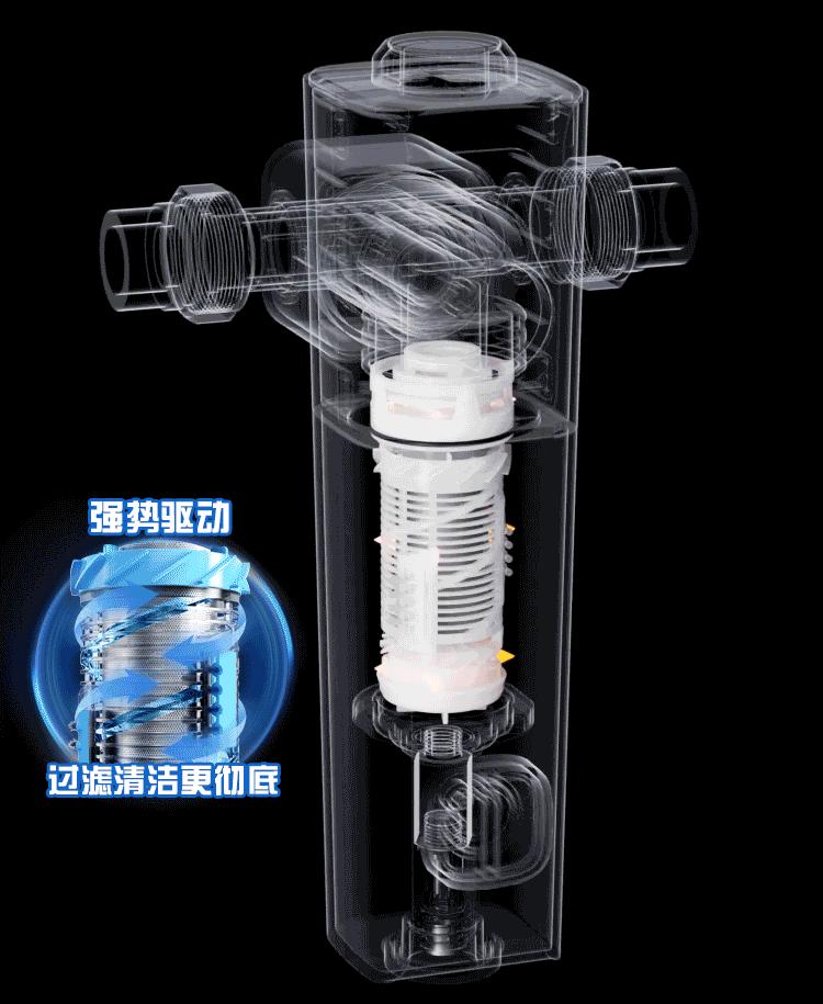 建議大家①:儘量去選擇具備雙螺旋水道、三渦輪水驅、雙虹吸沖洗,這三種排污模式結合的過濾器。具備這種設計後,當前置過濾器通水時即可啓動自清潔模式,每月只需打開排污按鈕沖洗一次,一分鐘不到過濾器內的污垢就能徹底沖洗乾淨,非常的方便。