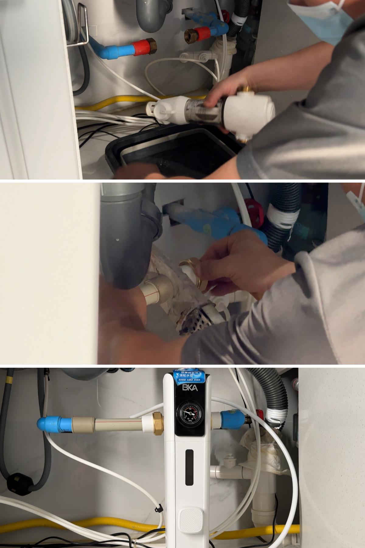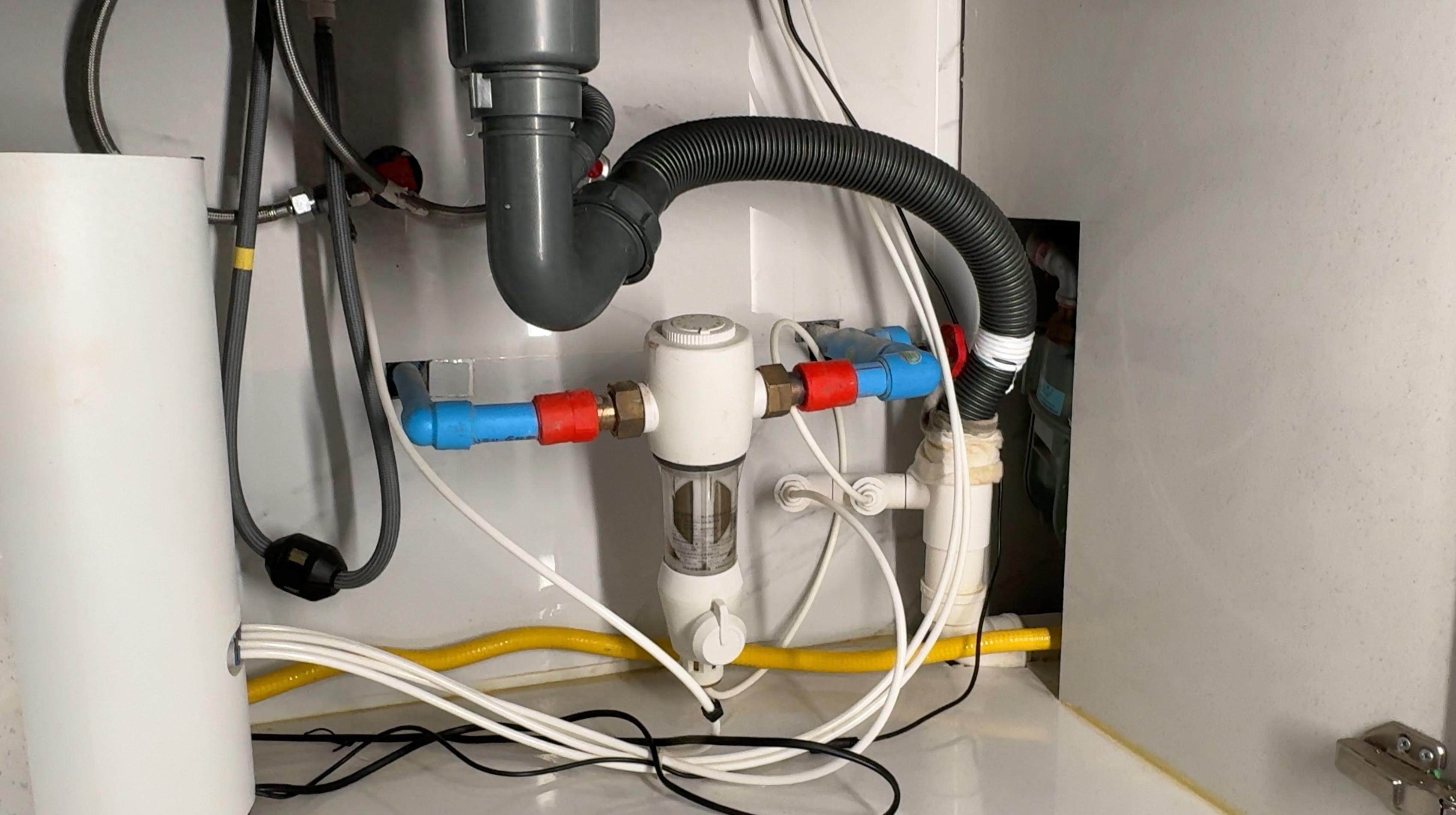 安裝前置過濾器的朋友一定注意,家裏廚房電器比較多的話,一定要捋順位置,預留好管道。整體安裝師傅比較專業,關閉完總水閥,做了一個簡單的水流回路就完事了,而其管口與水管連接的地方還做了熱熔處理,結實又能防止漏水。
