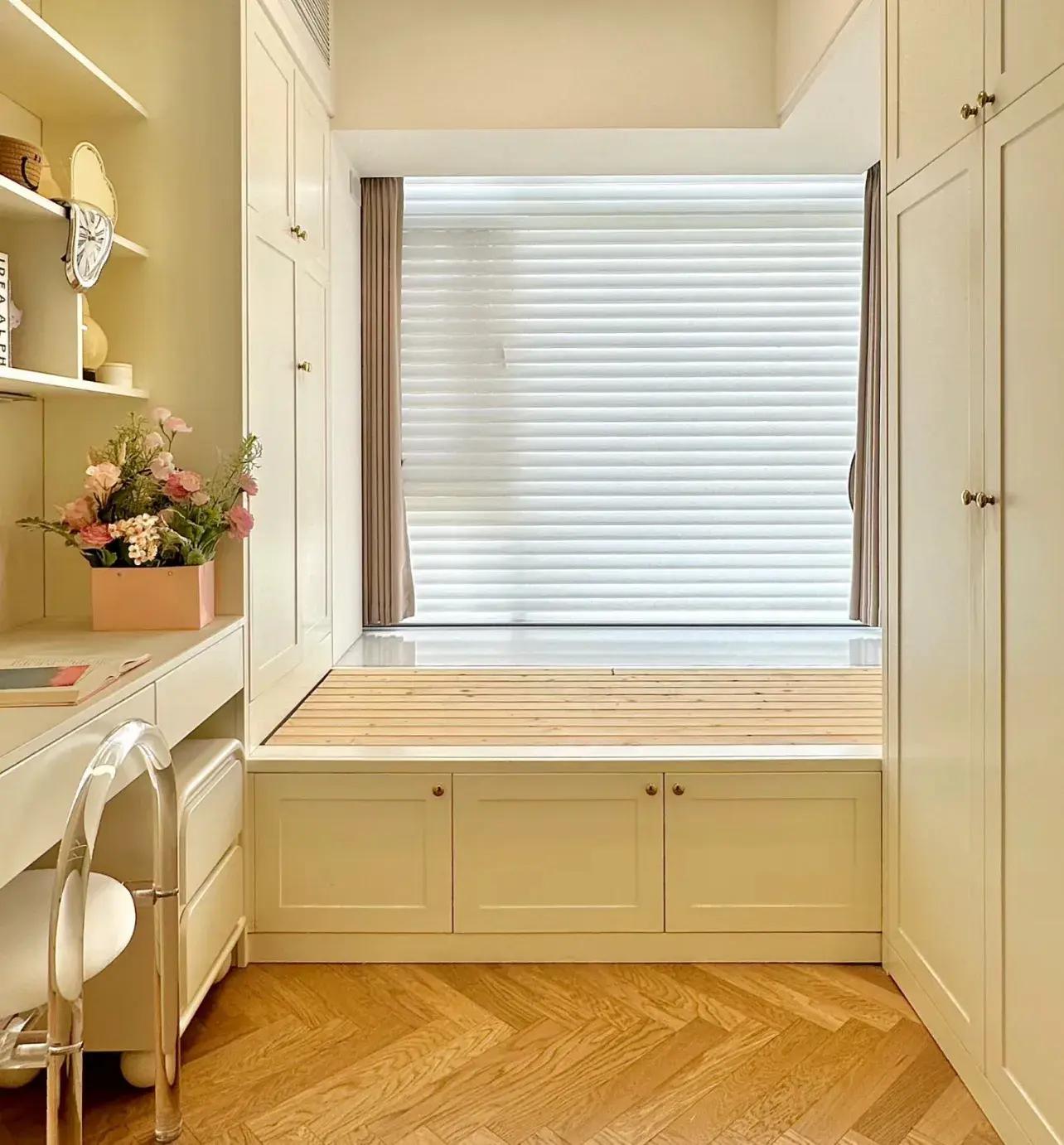 不僅給小臥室增加了書桌、梳妝檯功能,還可以利用桌面和飄窗的高度差,做一排抽屜,增加臥室的儲物空間。