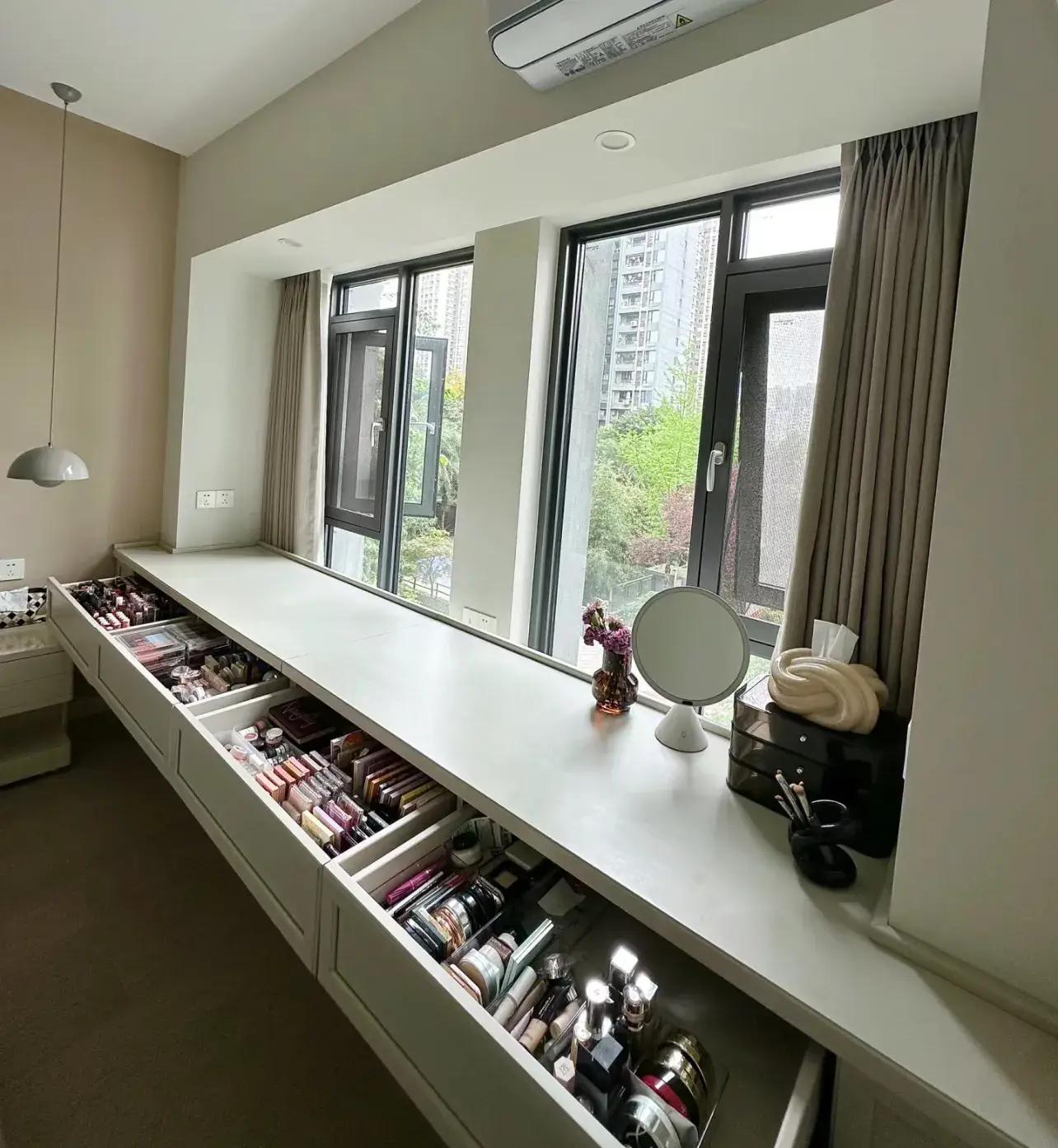 尤其是遇到這種大飄窗,做一長排抽屜,那真的能裝不少東西!